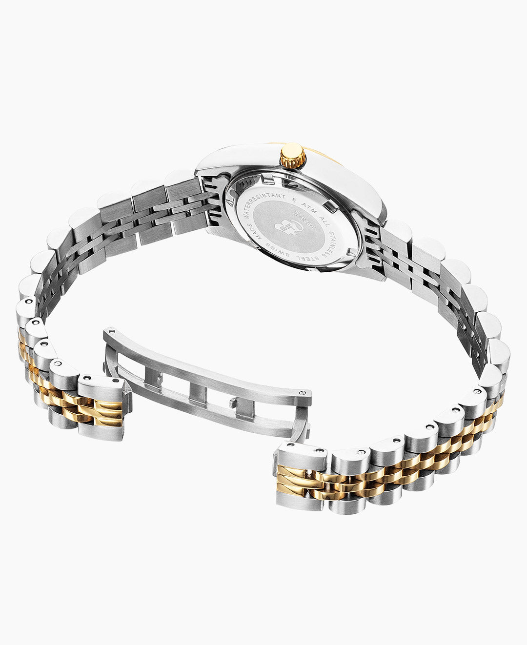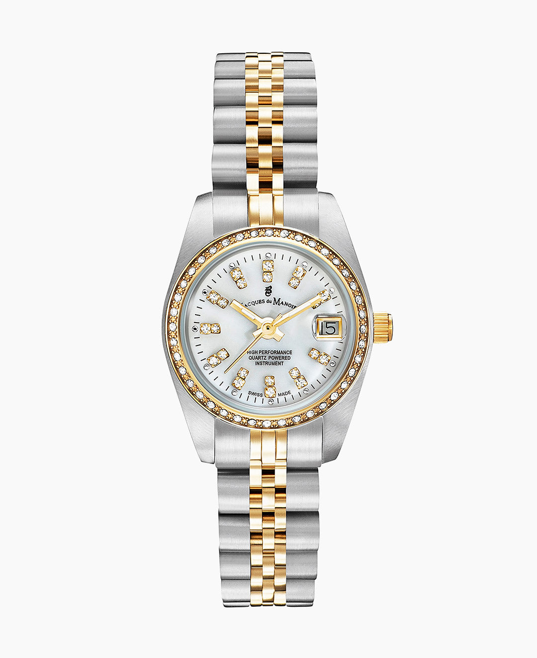 The Jacques Du Manoir Inspiration Elegance NROP.08 captures refined femininity in a compact 26mm design, pairing shimmering two-tone stainless steel with a clean white dial. Its elegant proportions make it a versatile accessory that enhances both everyday and dressy looks. Powered by a precise quartz movement, it features a practical date function for daily convenience. The mineral glass offers dependable durability, while 5 ATM water resistance provides confidence for regular wear. With its stylish two-tone finish and timeless appeal, this timepiece brings effortless sophistication to the modern woman’s collection.