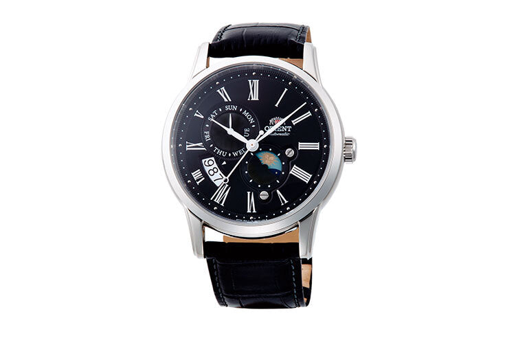 The Orient RA-AK0010B blends traditional elegance with practical multi-function design, featuring a striking black dial with Roman numeral markers and dedicated displays for date, day, and a sun & moon indicator. The sapphire crystal and polished 42.5mm stainless steel case elevate its premium feel, while the crocodile-textured leather strap adds a refined, all-occasion touch.