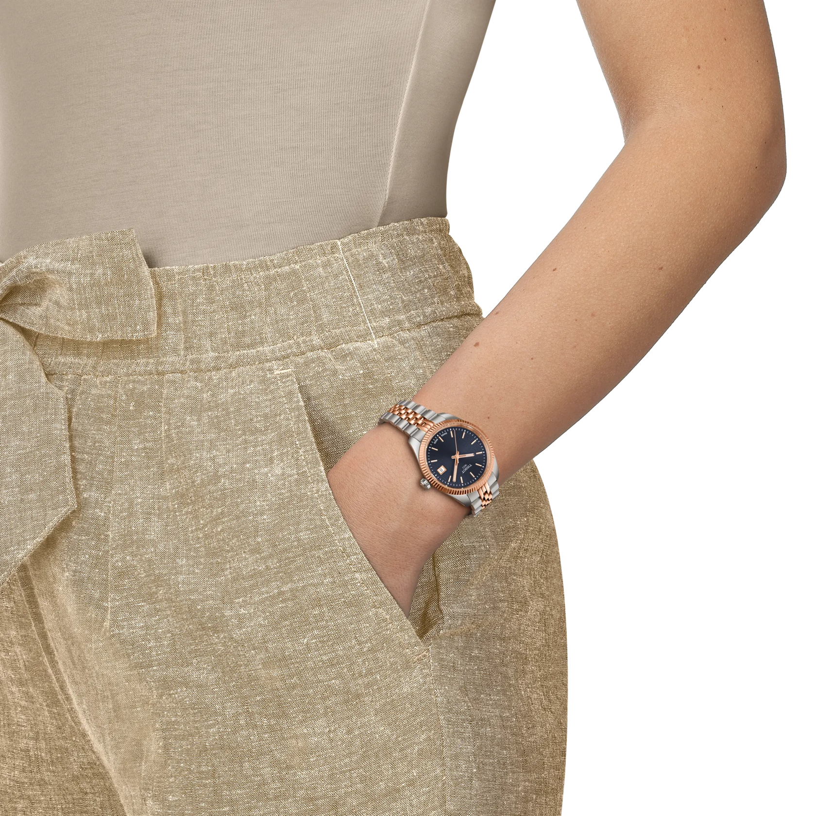 The Tissot Ballade T156.210.22.041.00 is crafted to elevate refined moments with a design rooted in traditional watchmaking elegance. Its 34 mm stainless steel case with rose gold PVD and sapphire crystal with antireflective coating ensures clarity and durability in daily wear. The blue dial features sunbeam-like reflections that add depth, paired with luminous hands for improved readability. A fluted bezel introduces a classic decorative touch, highlighting Tissot’s heritage craftsmanship. The quick-release bracelet system offers effortless versatility, allowing the wearer to adapt the look with ease while the SKU T156.210.22.041.00 integrates seamlessly into the watch’s contemporary identity.