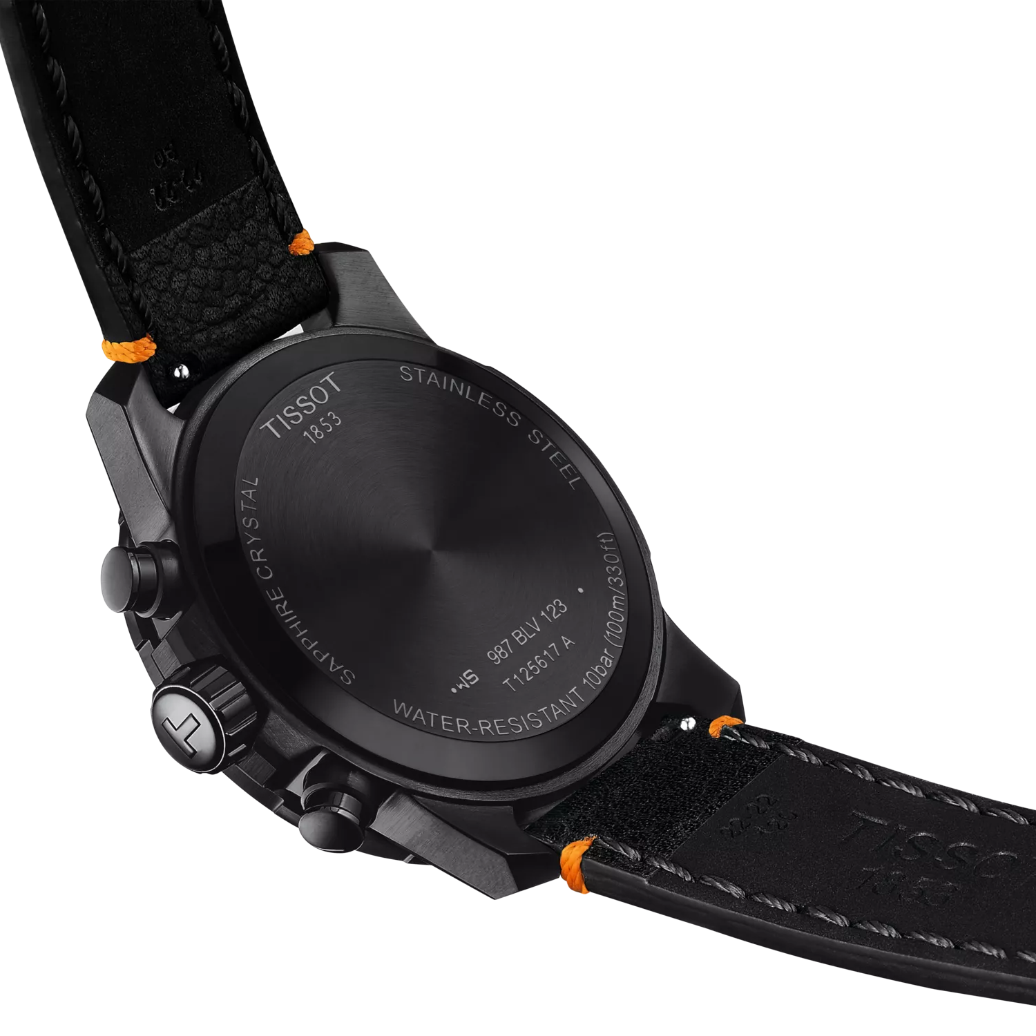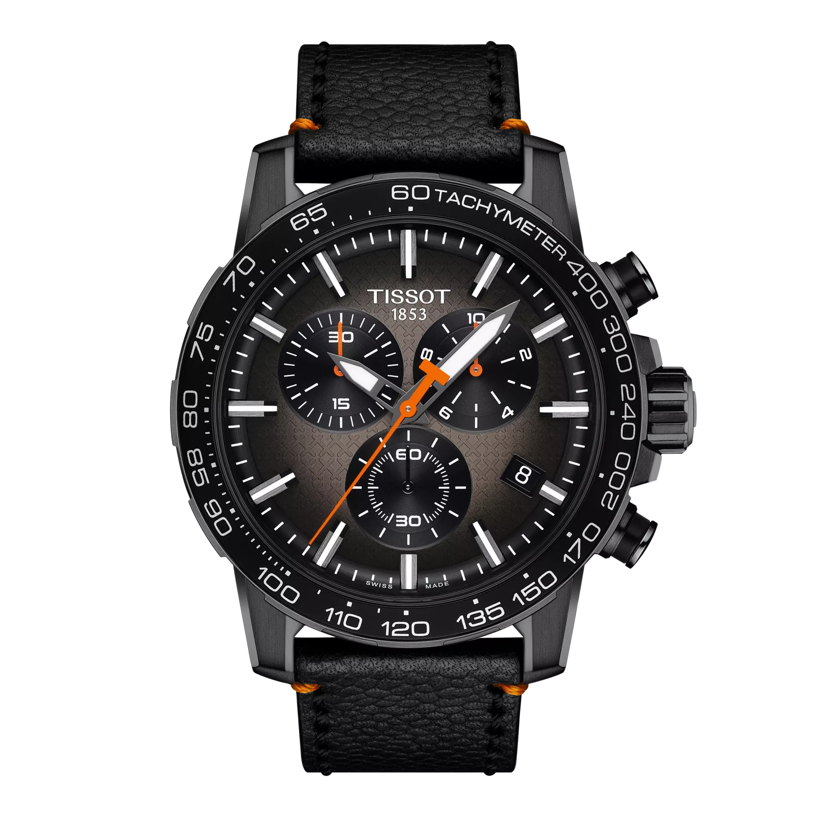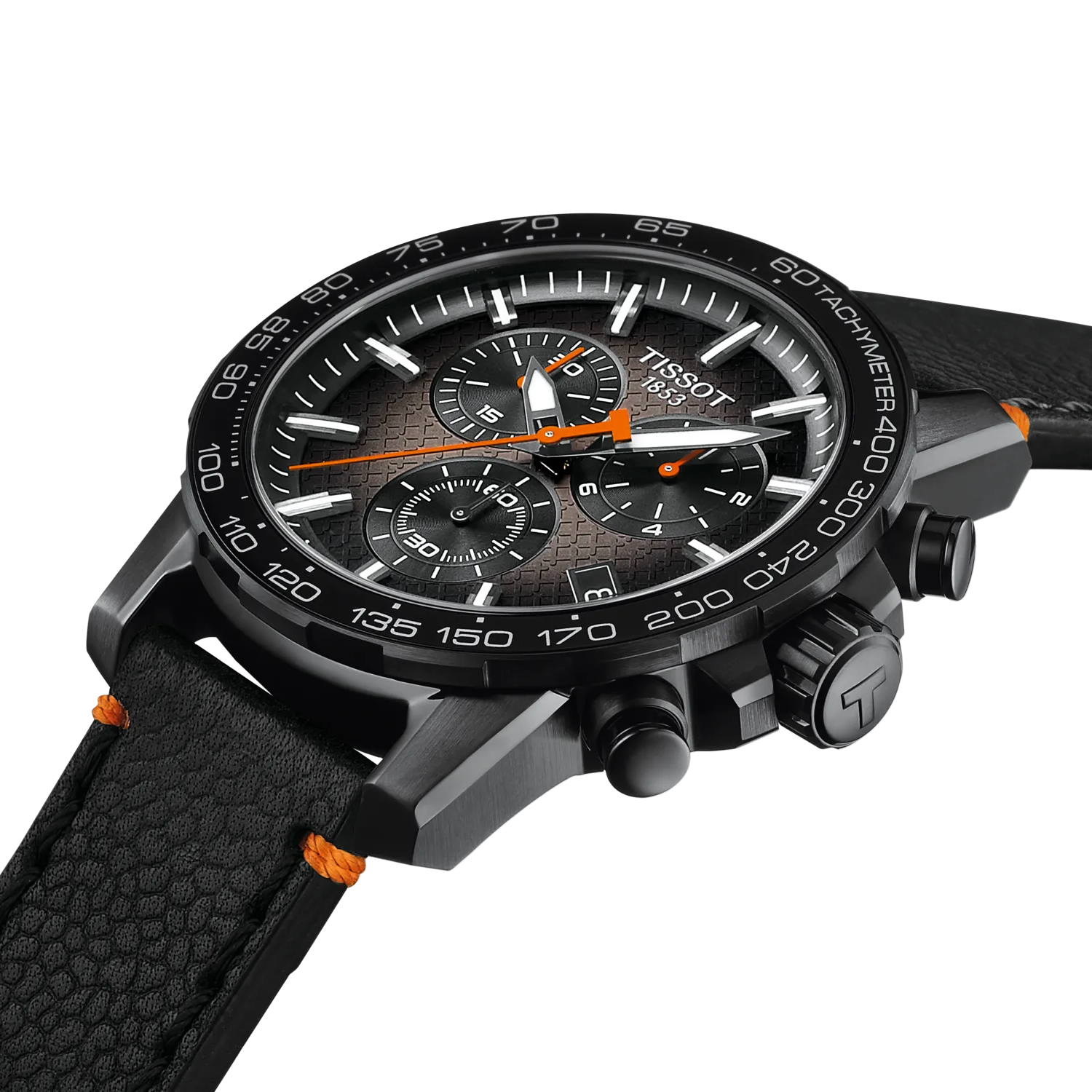 The Tissot Supersport Chrono Basketball Edition T125.617.36.081.00 blends Swiss precision with basketball-inspired design for a bold, modern sports chronograph. Its 45.5 mm case with black PVD coating pairs with a graded grey-black dial that features a basketball net pattern, complemented by orange accent stitching for a dynamic look. Powered by a Swiss quartz movement with an End-of-Life indicator, it ensures reliable performance in everyday situations. Super-LumiNova® on the hands and indexes enhances readability, while the embossed leather strap offers comfort with a distinctive style. An interchangeable quick-release system allows easy personalization, making this Supersport edition a strong statement piece with athletic character.