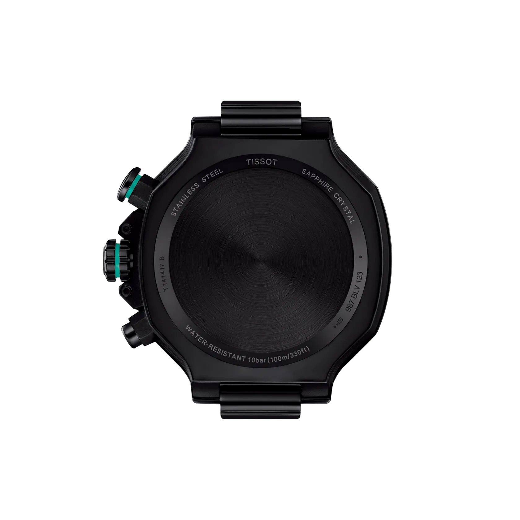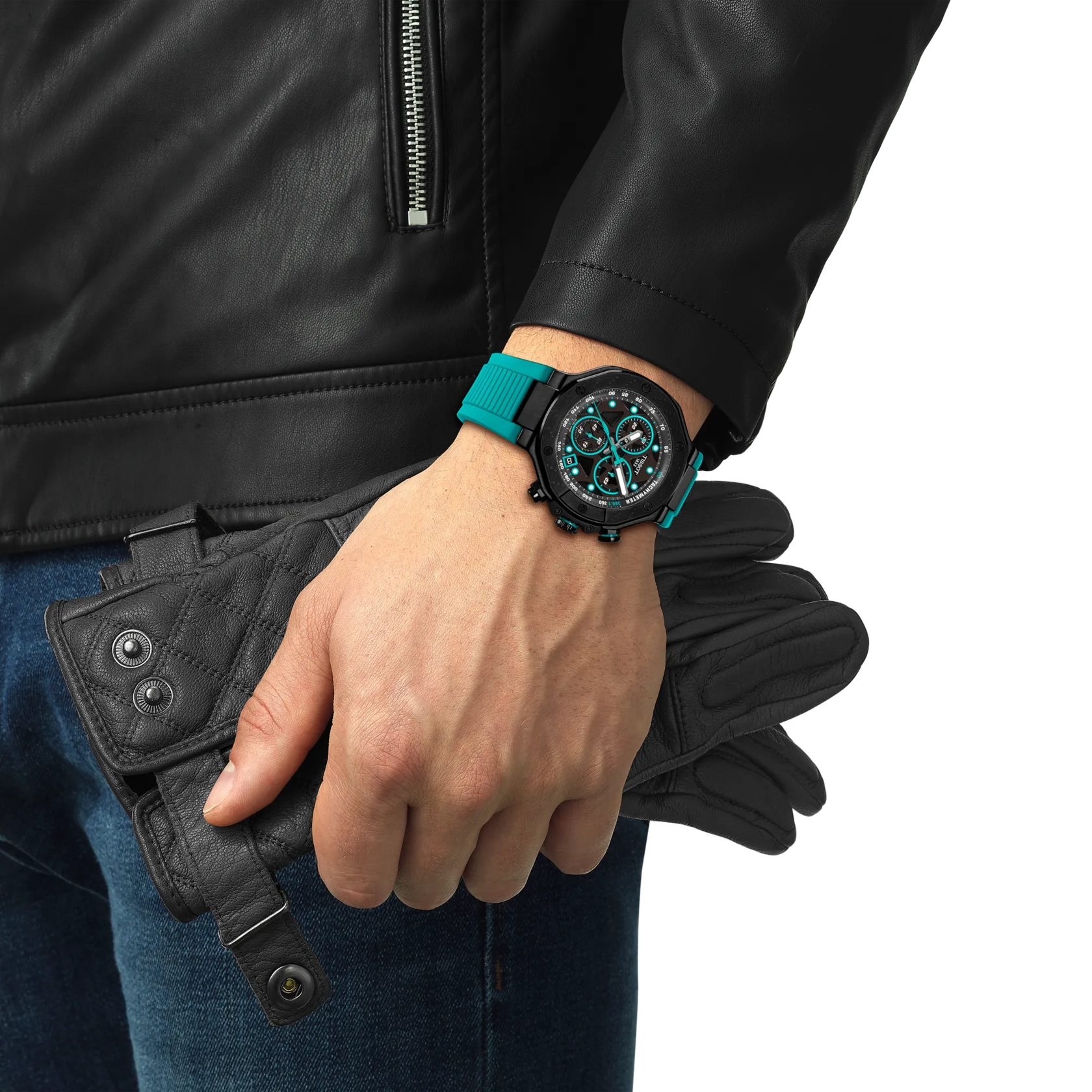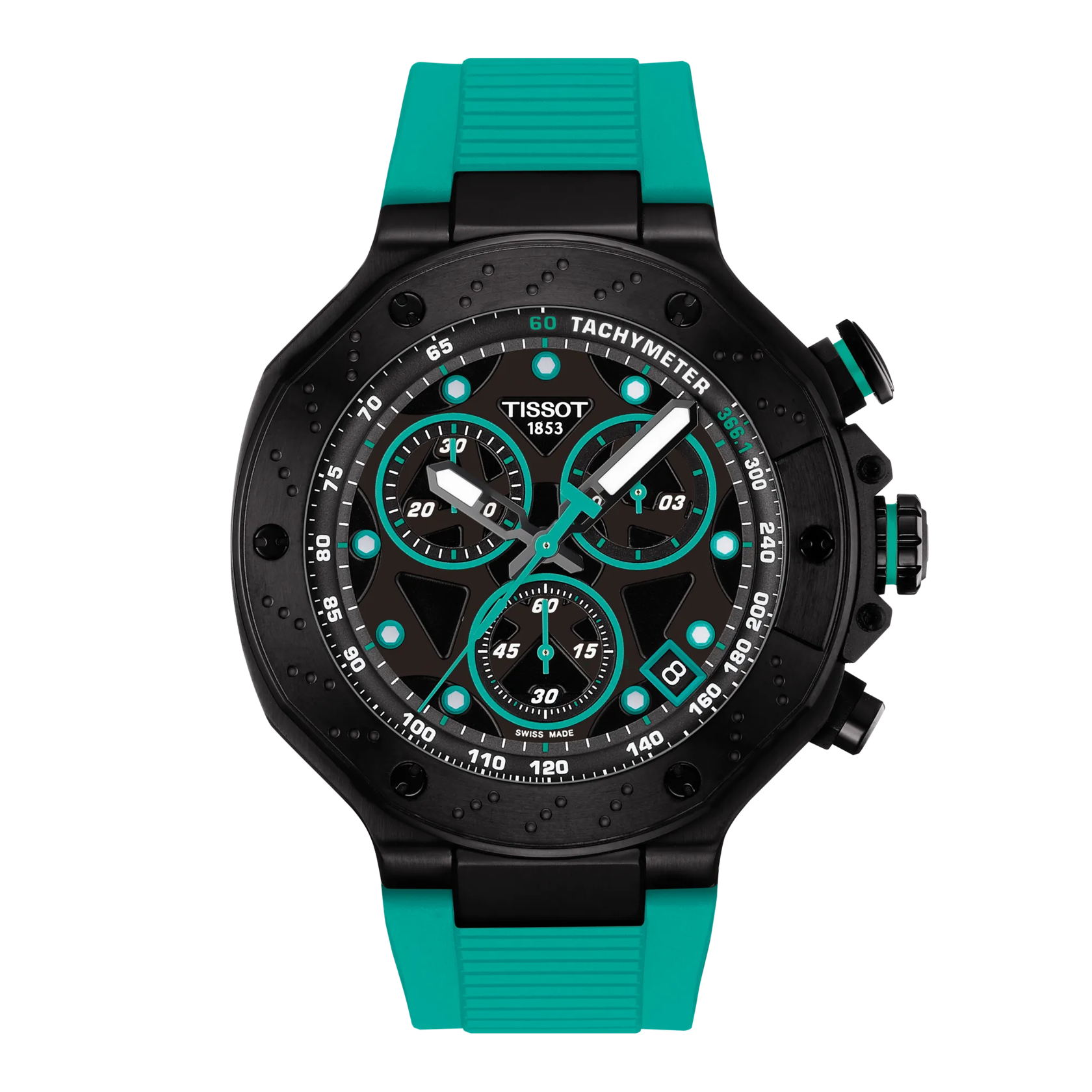 The Tissot T-Race T141.417.37.051.01 channels the bold spirit of motorcycle racing, blending dynamic styling with practical performance. Its 45 mm case with black PVD coating is paired with an anti-reflective sapphire crystal for enhanced durability and clarity. The black dial features distinct hour and minute hands coated with Super-LumiNova, providing visibility for active wear. Powered by a Swiss quartz chronograph movement with an End-of-Life indicator, it delivers consistent precision for everyday timing needs. The green synthetic strap adds a sport-driven character and ensures comfortable wear, perfectly complementing this modern rider-inspired design. Incorporating the SKU T141.417.37.051.01, it stands as a robust and energetic chronograph ready for any challenge.