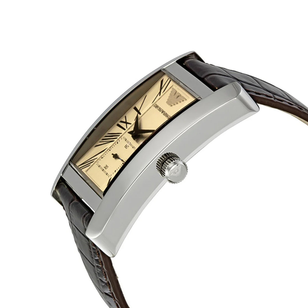 The Emporio Armani AR0154 Classic blends refined minimalism with timeless Italian design. Its 34mm stainless steel case houses a softly toned beige dial, complemented by silver-tone hands for clean, easy readability. Powered by a reliable Japan quartz movement and protected by a scratch-resistant mineral crystal, it offers dependable daily wear. The brown croco-embossed leather strap adds a touch of sophistication, making it ideal for work, evenings out, and dress occasions. With 50M water resistance and a slim, comfortable profile, this watch delivers both elegance and practicality.