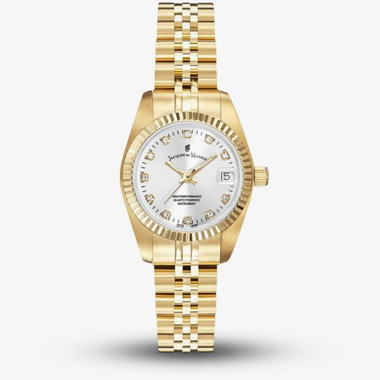 The Jacques Du Manoir Horizon Ladies Watch JWL03601 is a Swiss Made masterpiece, blending timeless elegance with modern craftsmanship. This stunning timepiece features a 31mm stainless steel case and bracelet, offering both durability and a luxurious feel. The crisp white dial, enhanced with zirconia stone minute markers and silver-tone hands, exudes sophistication, making it the perfect accessory for any occasion.