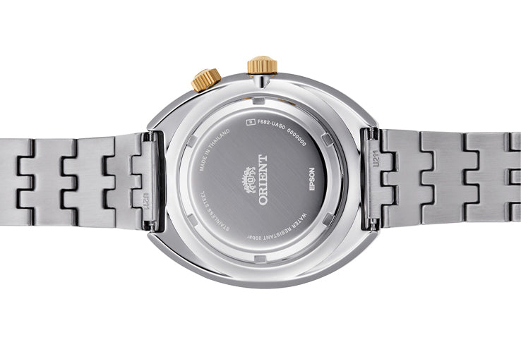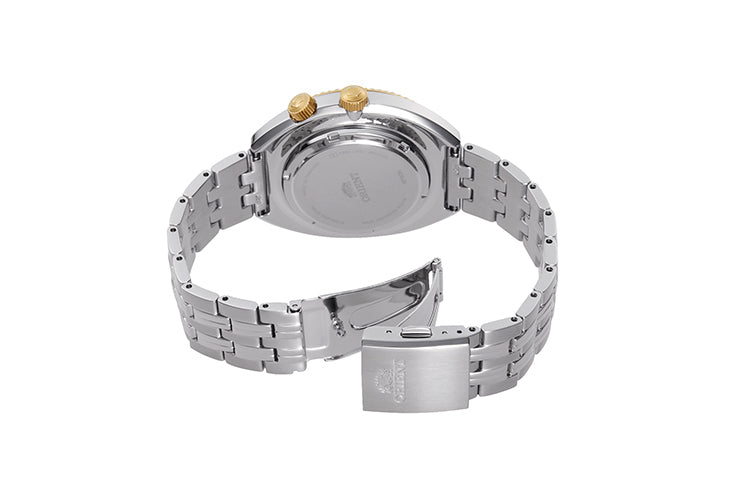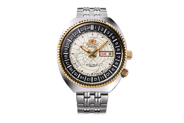 The Orient RA-AA0E01S Mechanical Revival World Map reintroduces the legendary 1969 model with a faithful recreation of its iconic spherical-effect world map dial. The ivory surface has been specially processed to create a lens-like depth, capturing the mystique and radiance of the original design while preserving its nostalgic character. Powered by the in-house Caliber F6922 automatic movement, the watch provides reliable self-winding performance along with hand winding, second-hand halt, and a full day/date display. A rotating inner bezel—controlled by the crown at four o’clock—adds a functional 24-hour time reference, maintaining the spirit of the original model. With a sturdy 43.5mm stainless steel case offering 200 meters of water resistance and a solid-link metal bracelet for comfort and durability, this Revival edition blends retro charm with modern practicality for everyday wear.