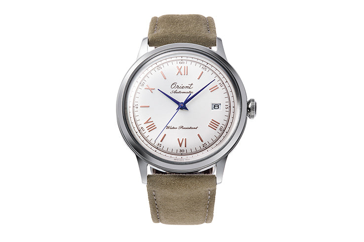 The Orient RA-AC0027S Mechanical Classic Limited Edition commemorates 75 years of Orient’s in-house mechanical watchmaking, combining refined vintage aesthetics with modern craftsmanship. Its crisp white dial features the historic 1950s cursive Orient logo, complemented by pink gold-coloured indices and striking blue hands for a distinctly retro look. The domed crystal glass enhances the nostalgic appeal, while the see-through caseback—engraved with “Orient Since 1950 75th Anniversary” and an individual serial number—reveals the elegant Caliber F6724 automatic movement inside. Offering self-winding capability, hand winding, a second-hand halt mechanism, and a practical date function, the watch blends tradition with dependable performance. Presented on a beige nubuck leather strap with an additional calf leather strap included, this 9,500-piece limited edition captures the spirit of Orient’s heritage in a timeless and versatile dress watch.