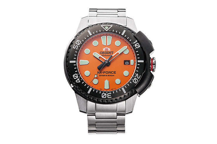 The Orient M-FORCE RA-AC0L08Y is a bold, ultra-durable adventure watch engineered for extreme environments. Inspired by the Earth’s ancient energy, its striking orange dial symbolizes glowing underwater lava vents, bringing explosive character to the wrist. Built to ISO 6425 standards for professional air diving, it offers 200m water resistance, a screw-down crown, a reinforced case shield, and a tough black uni-directional rotating bezel for complete underwater reliability.