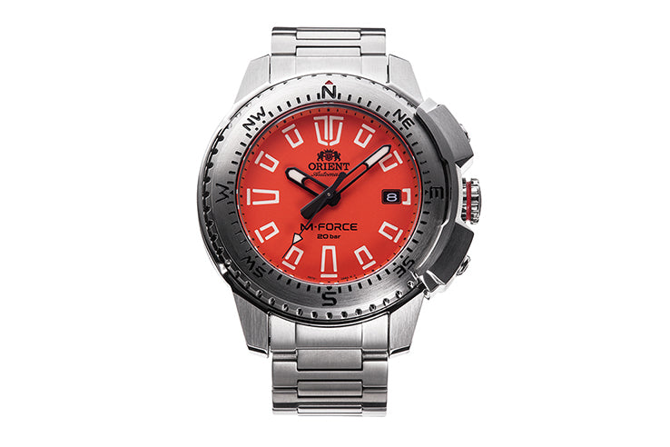 The Orient RA-AC0N02Y from the new M-FORCE lineup is engineered for serious outdoor performance, combining rugged construction with a bold, adventure-focused design. Its bi-directional compass bezel and heavy-duty protection shield reinforce the watch against impacts, while the sapphire crystal ensures superior scratch resistance. The distinctive dial—featuring tire-tread inspired indices and high-intensity luminous markers—delivers outstanding visibility in any environment.