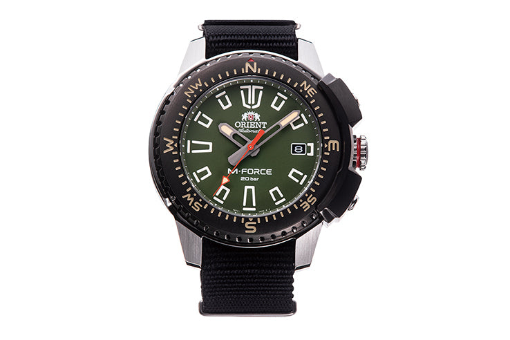 The Orient RA-AC0N03E from the next-generation M-FORCE lineup is purpose-built for outdoor exploration, engineered with a bidirectional compass bezel and a reinforced case shield that protects the bezel and oversized crown from impacts. Its rugged dial design—featuring off-road–inspired indices and powerful luminous markers—enhances readability in any environment, while the sapphire crystal ensures superior scratch resistance.