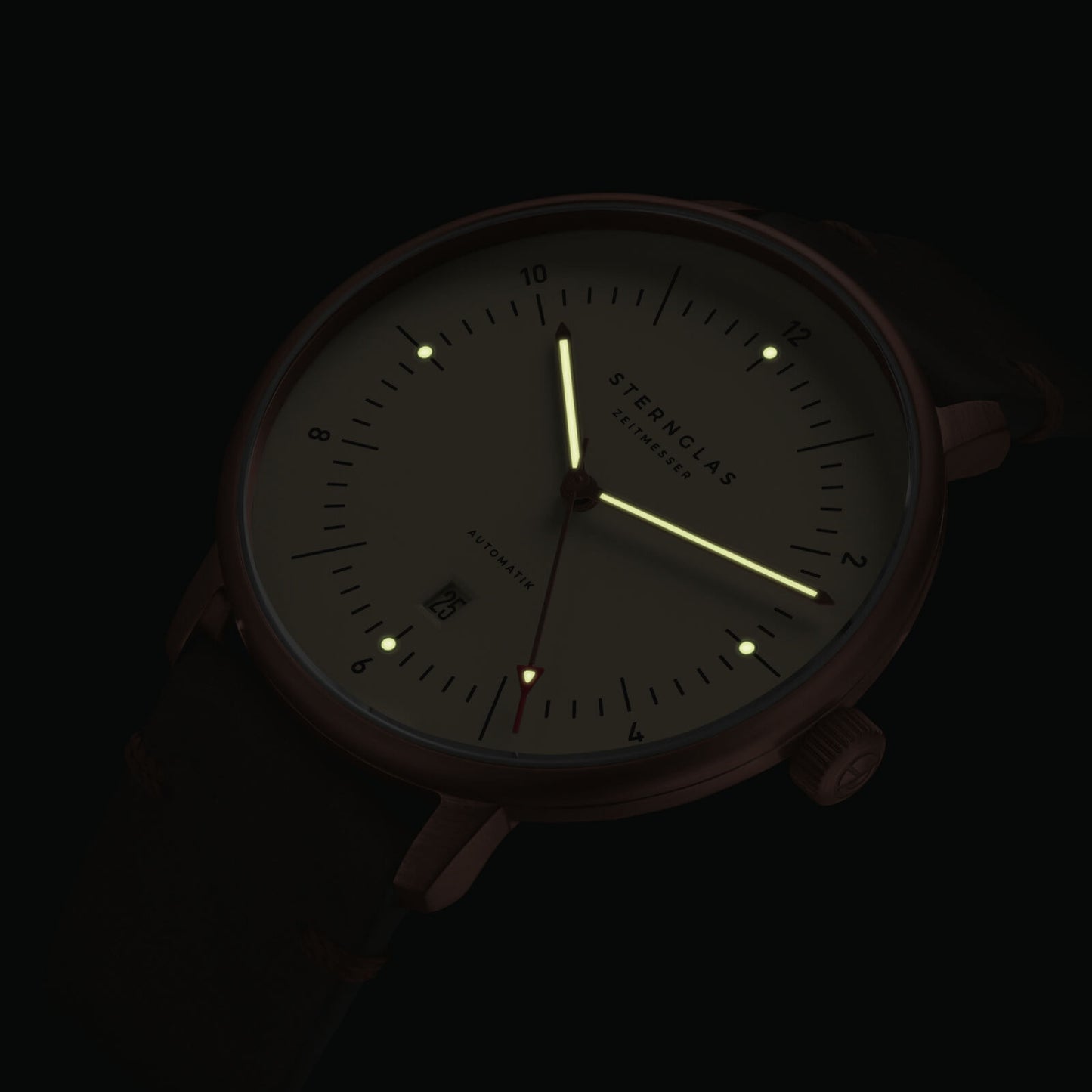 The Sternglas Naos XL Automatik brings a bold 42mm presence to the Bauhaus-inspired Naos line, pairing a brushed PVD bronze stainless steel case with an elegant alabaster satin-finished dial. Its domed sapphire crystal with double anti-reflective coating ensures long-lasting clarity while highlighting the clean, minimalist dial enhanced by Luminova-coated hands for improved low-light readability. Powered by the Miyota 8215 automatic movement, the watch offers hacking seconds, manual winding, a practical date function, and a 42-hour power reserve for reliable daily performance. Completed with a refined 20mm SuperSlim bronze stainless steel bracelet and rated to 5 ATM water resistance, this Naos XL edition delivers a commanding yet sophisticated look suited to both modern and classic styles.
