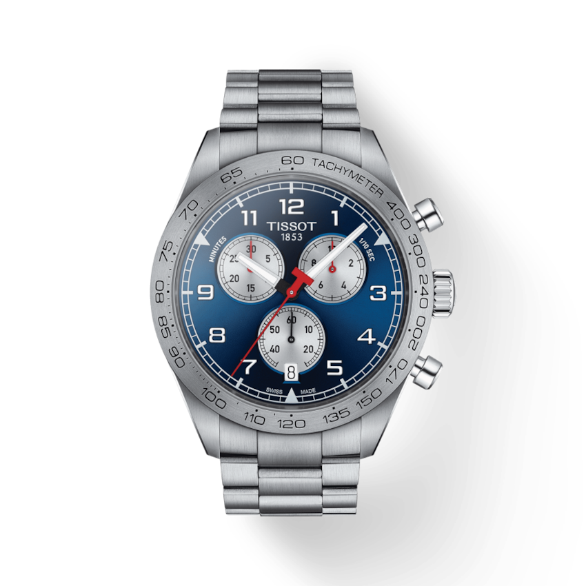 Blue with white hands and Arabic numeral hour markers, minute markers around outer rim, tachymeter scale, analog, luminescent hands and markers, date display at 6 o'clock position |