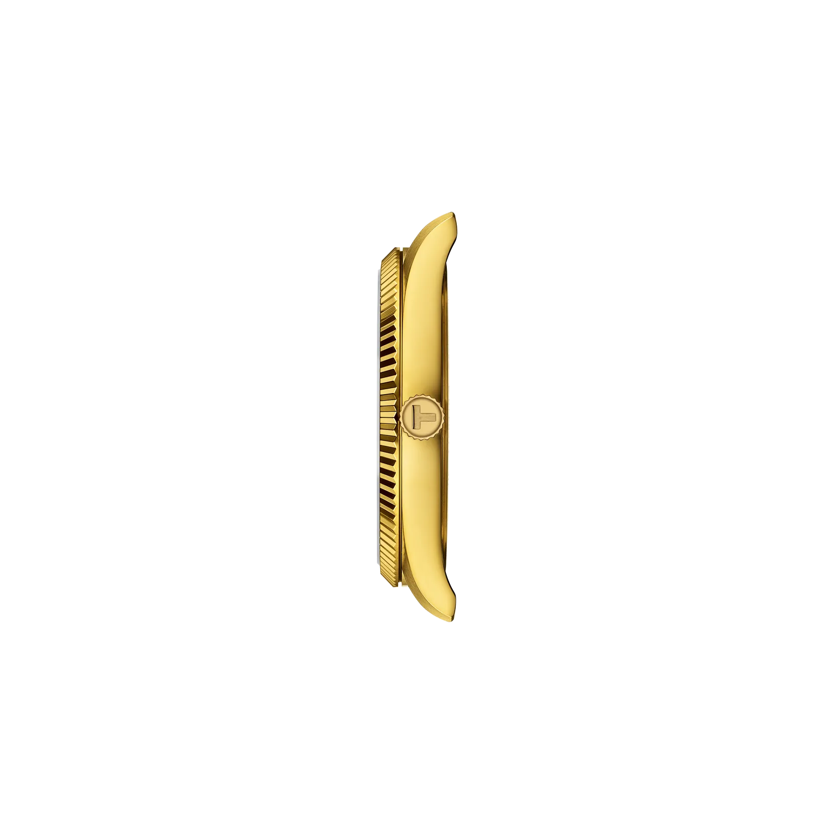 The Tissot Ballade T156.410.33.051.00 is designed to elevate special moments with a refined balance of traditional craftsmanship and modern elegance. Its 40 mm case, enhanced with yellow gold PVD and paired with a sapphire crystal featuring anti-reflective coating, offers durability and clarity in every light. The black guilloché dial showcases sunbeam rays that shift beautifully with movement, while the fluted bezel adds a classic touch inspired by heritage watchmaking. Powered by a precise Swiss quartz movement with an End-of-Life indicator, the Ballade ensures reliable daily performance. The gold-tone bracelet includes a quick-release system for effortless style transitions, integrating the SKU T1564103305100 into a sophisticated and versatile timepiece.