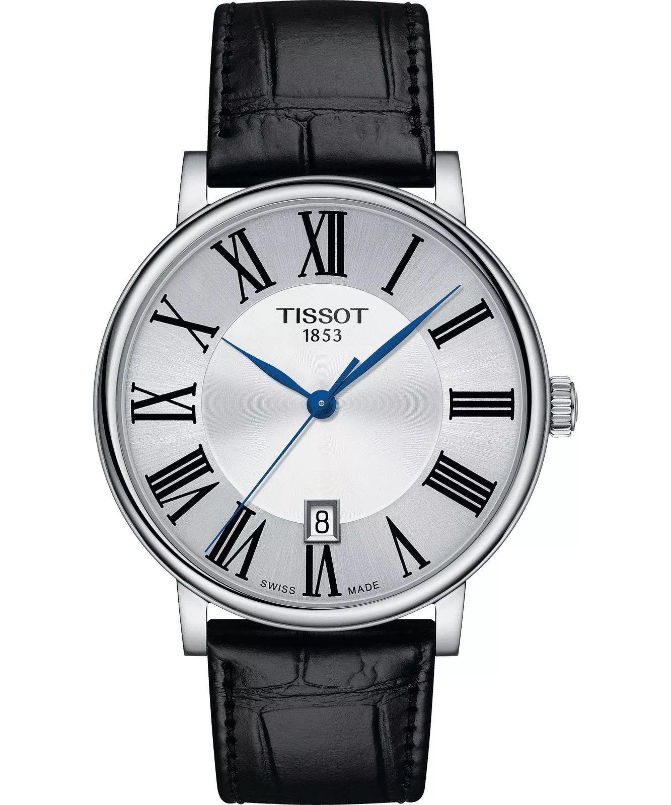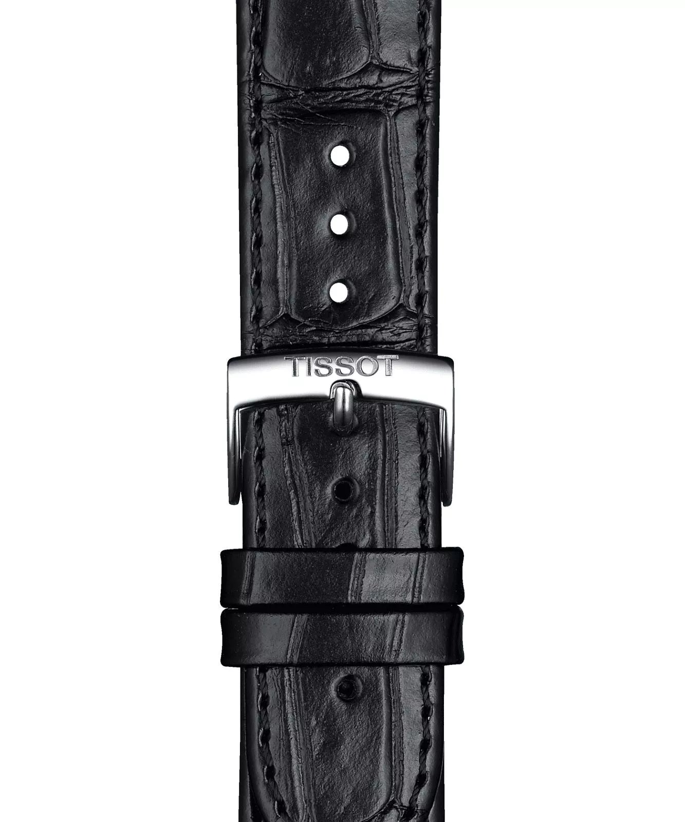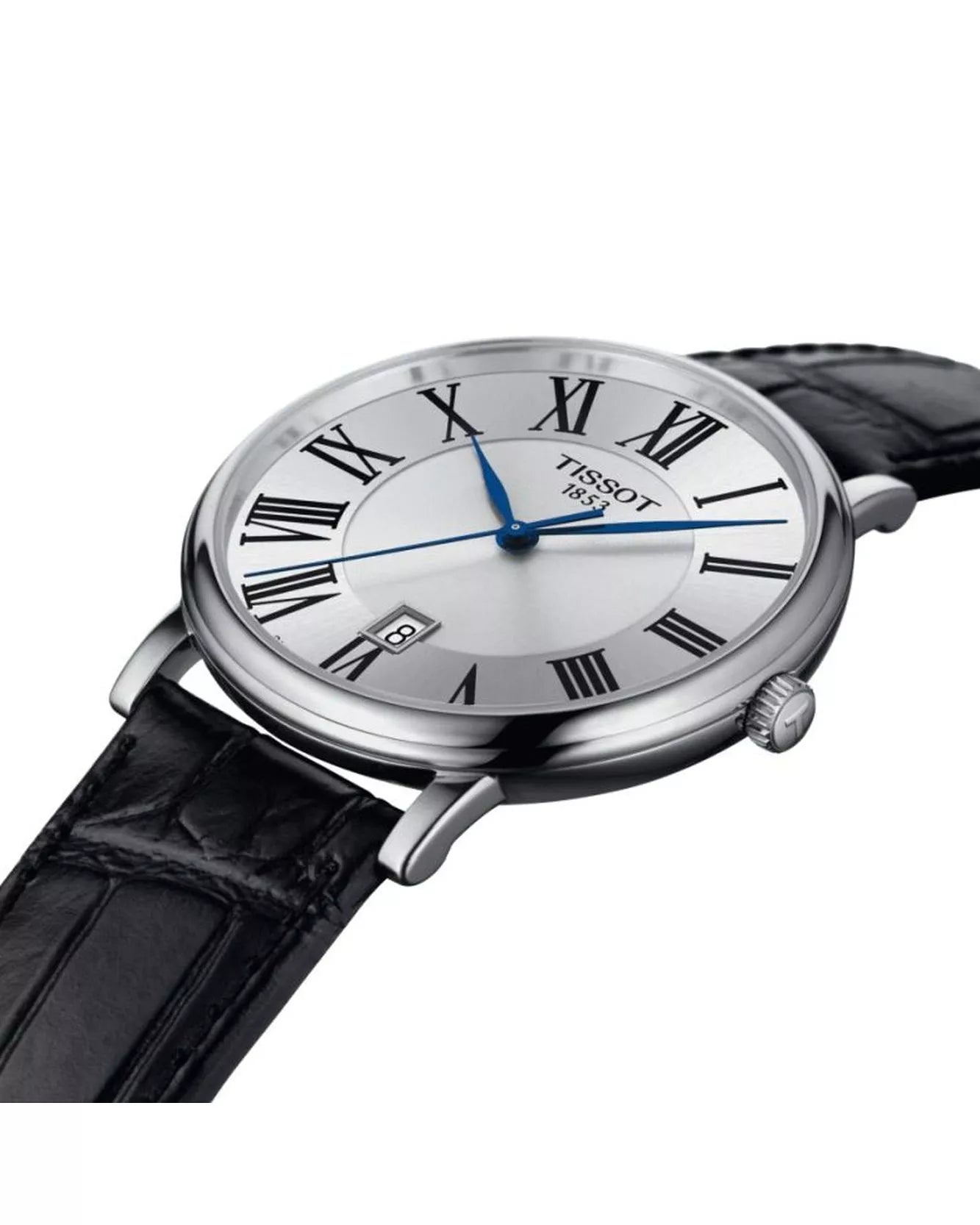 The Tissot Carson Premium T122.410.16.033.00 offers timeless versatility with its refined 40mm stainless steel case and elegant silver sunray dial. Powered by the Swiss-made ETA F06.115 quartz movement, it ensures dependable accuracy with an End-of-Life indicator for added reliability. The slim 6.97mm profile and scratch-resistant sapphire crystal enhance both comfort and durability, making it ideal for everyday wear. Its black leather strap provides a classic finish, while 50m water resistance supports practical daily use. Designed with clean Roman-inspired detailing, this watch transitions seamlessly from business to evening settings.