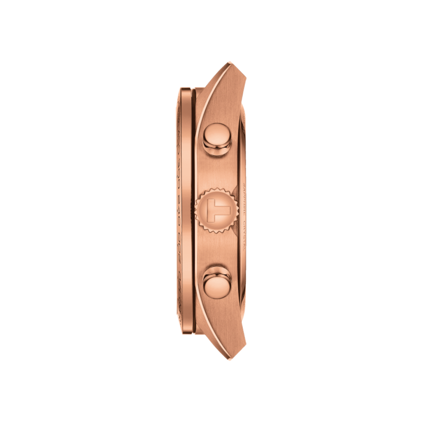 This watch is powered by Tissot Caliber G10.212 quartz chronograph movement and features a calendar with date display at 6 o'clock, chronograph sub-dials displaying 1/10th of a second, 60 seconds and 30 minutes. The watch also has the functions of date, hour, minute, and second. The scratch-resistant sapphire crystal protects the watch face and the round case shape with a case size of 45mm and case thickness of 12.1mm makes it comfortable to wear. The solid case back and water resistance up to 100 meters - 330 feet make it suitable for any adventure.