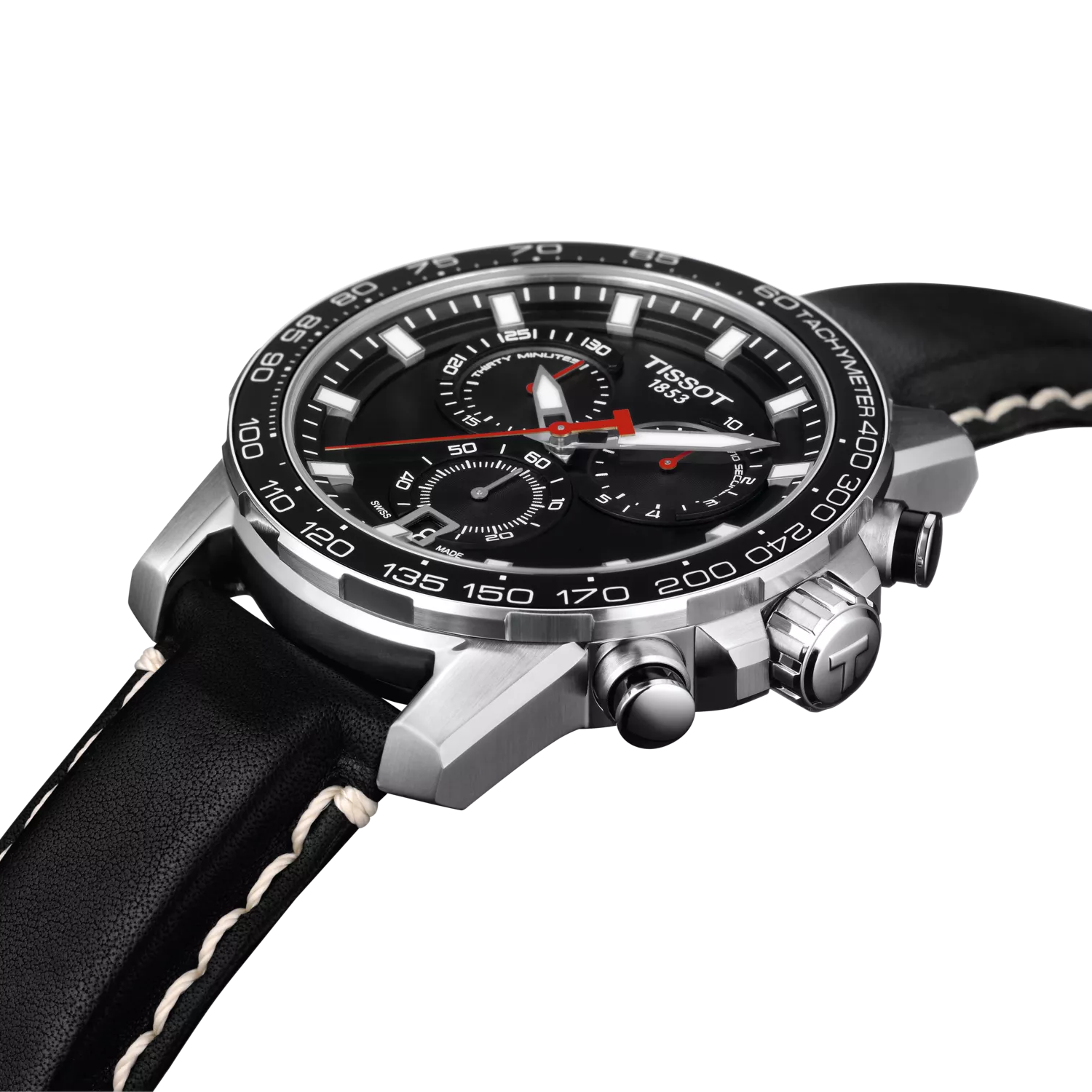The Tissot Supersport Chrono T125.617.16.051.00 embodies a bold and athletic character, designed for those who appreciate dynamic styling and reliable performance. Its 45.5 mm stainless steel case with an aluminium bezel ring creates a strong presence on the wrist, while the black dial and Super-LumiNova® hands ensure excellent readability. Powered by a Swiss quartz movement featuring chronograph counters and an end-of-life indicator, it delivers precise timing for everyday use. The embossed leather strap adds comfort and versatility, supported by an interchangeable quick-release system for effortless strap changes. With 10-bar water resistance and a modern sport-forward design, this Supersport Chrono is crafted for durability and confidence.