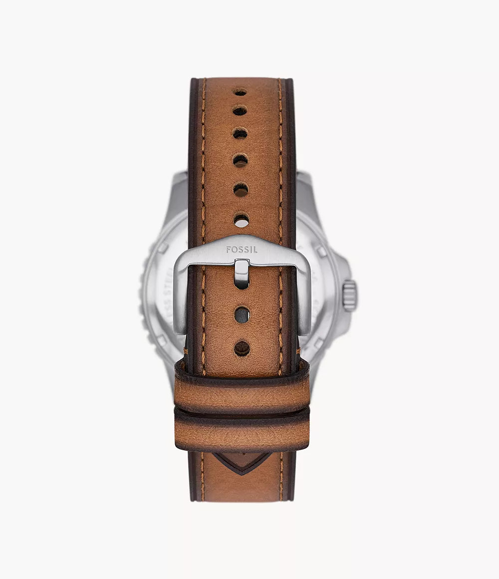 The Fossil Blue Dive Quartz Men’s Watch brings together sport-inspired performance and modern design. Featuring a vibrant green dial housed in a robust silver-tone stainless steel case, this watch captures a bold yet refined aesthetic. The tan leather strap adds a casual, earthy touch, secured with a single prong buckle for comfort and durability. Powered by a dependable quartz movement (battery type SR626SW), it ensures accurate timekeeping for everyday wear. Protected by a mineral crystal and built with the durability expected from the Fossil Blue Dive collection, this watch is perfect for those who value style and substance in equal measure.