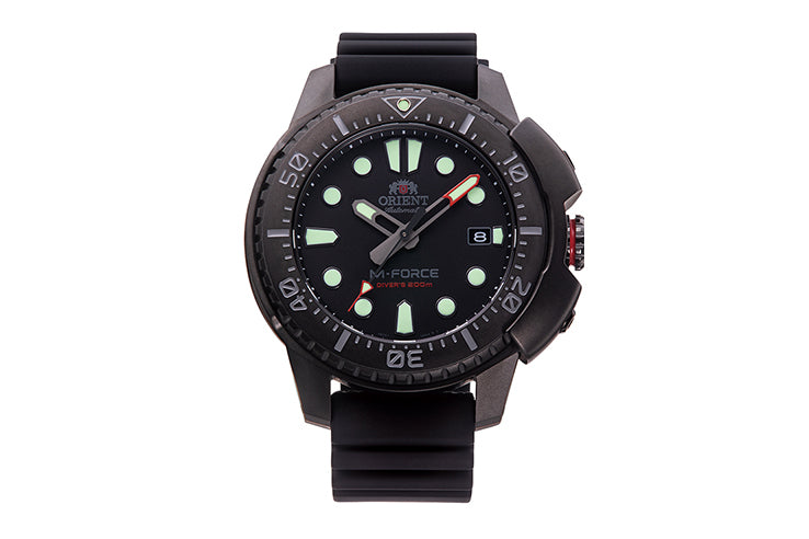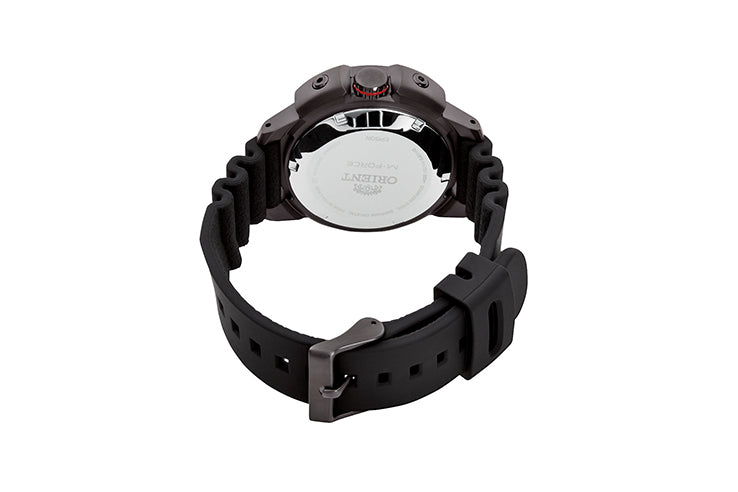 The Orient M-FORCE RA-AC0L03B is engineered for extreme adventure, meeting ISO standards for Air Diver’s 200m performance. Its rugged 45mm stainless steel case is reinforced with a protective shield that guards both the bezel and screw-down crown, ensuring enhanced resistance against shocks and external pressure. The sapphire crystal with anti-reflective coating provides clarity in any environment, while embossed indices coated with strong Luminous Light deliver excellent readability underwater or in low light.
