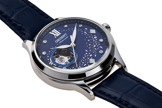 Inspired by the colours and sparkle of the night sky, the Orient RA-AG0018L “Blue Moon” blends celestial elegance with fine mechanical engineering. Its blue sunburst dial features Swarovski crystal markers, a shooting-star pattern, and a halo-accented semi-skeleton window at 9 o’clock that reveals the movement within. Curved crystal glass and a refined 35.6mm steel case add classic charm to the design.