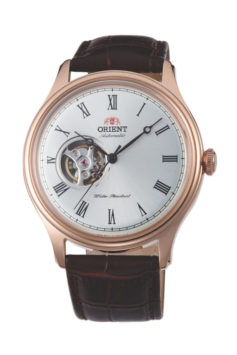The Orient TAG00001S0 Classic brings timeless sophistication through its domed silver bombe dial, gracefully curved lugs, and premium rose-gold stainless steel case. Its semi-skeleton opening highlights the precision of the in-house automatic movement, while the crocodile-pattern leather strap adds a refined finishing touch.