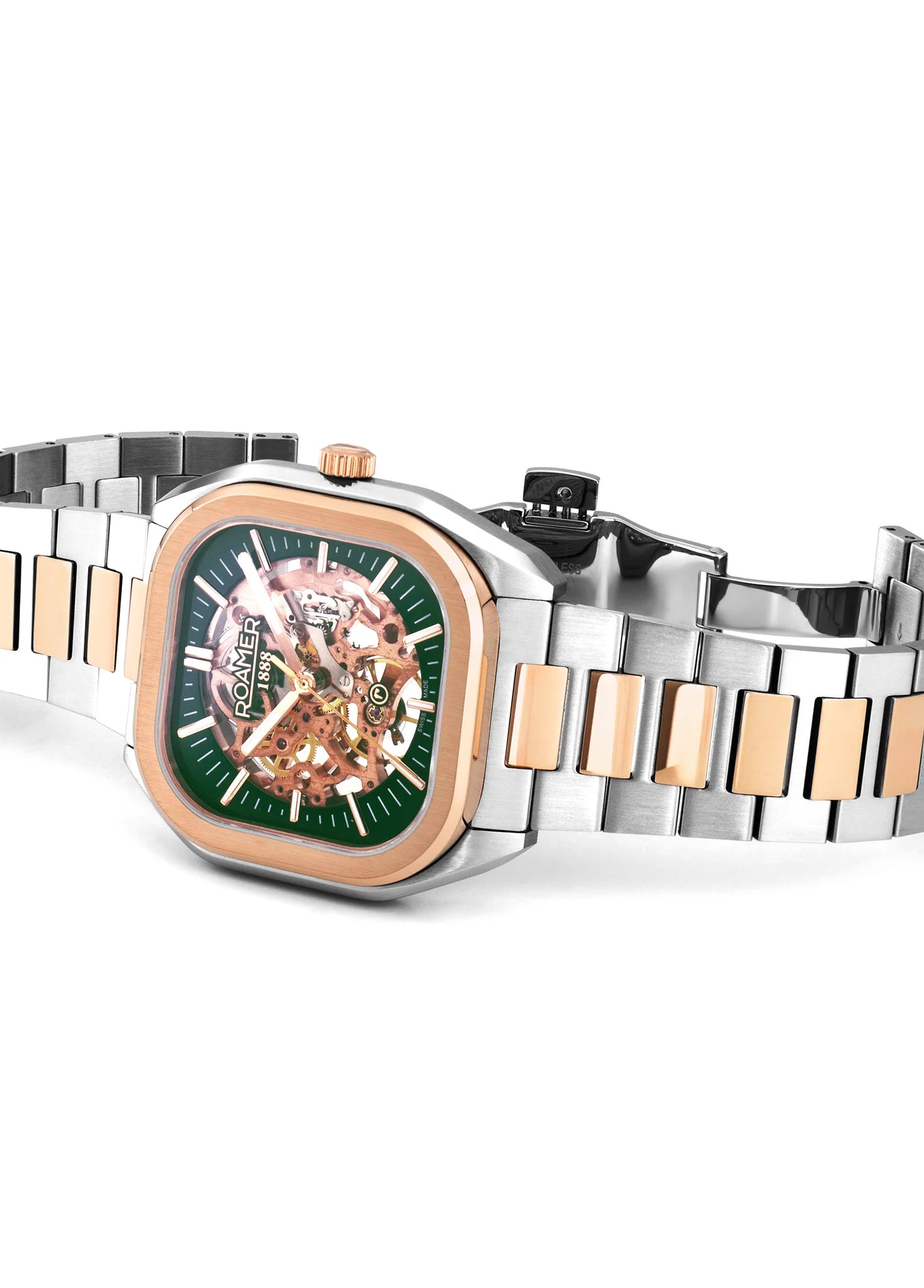 The Swiss Made MST-23 movement by Meyer & Stüdeli showcases Roamer's commitment to tradition, as the company revives its historic roots from the early 20th century. This timepiece also features scratch-resistant anti-reflective sapphire crystal and a vibrant green dial with slender baton hour markers, including double markers at the 12 o'clock position. The 50-meter water resistance (5 ATM) ensures its durability for everyday wear, while the butterfly clasp secures the watch comfortably on your wrist.