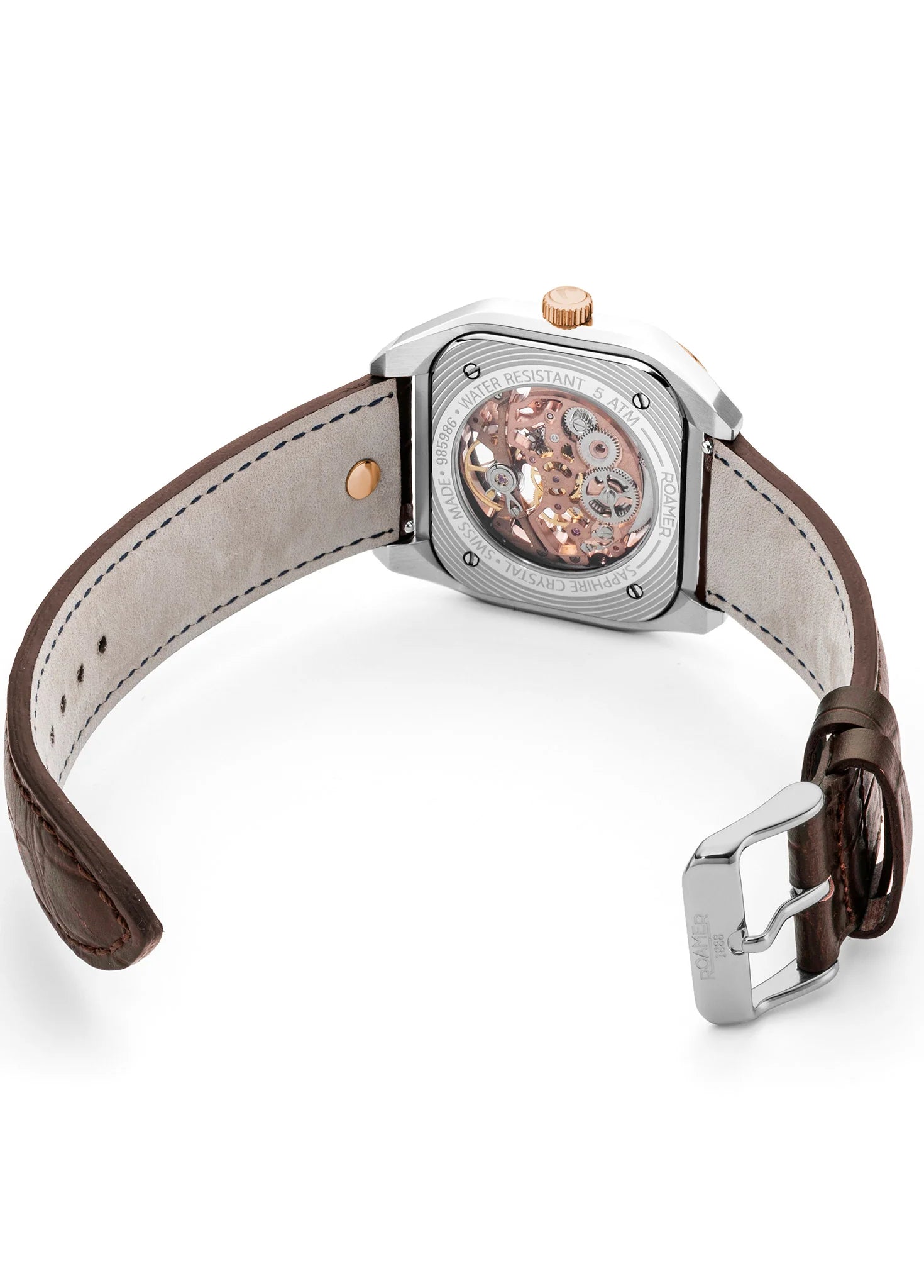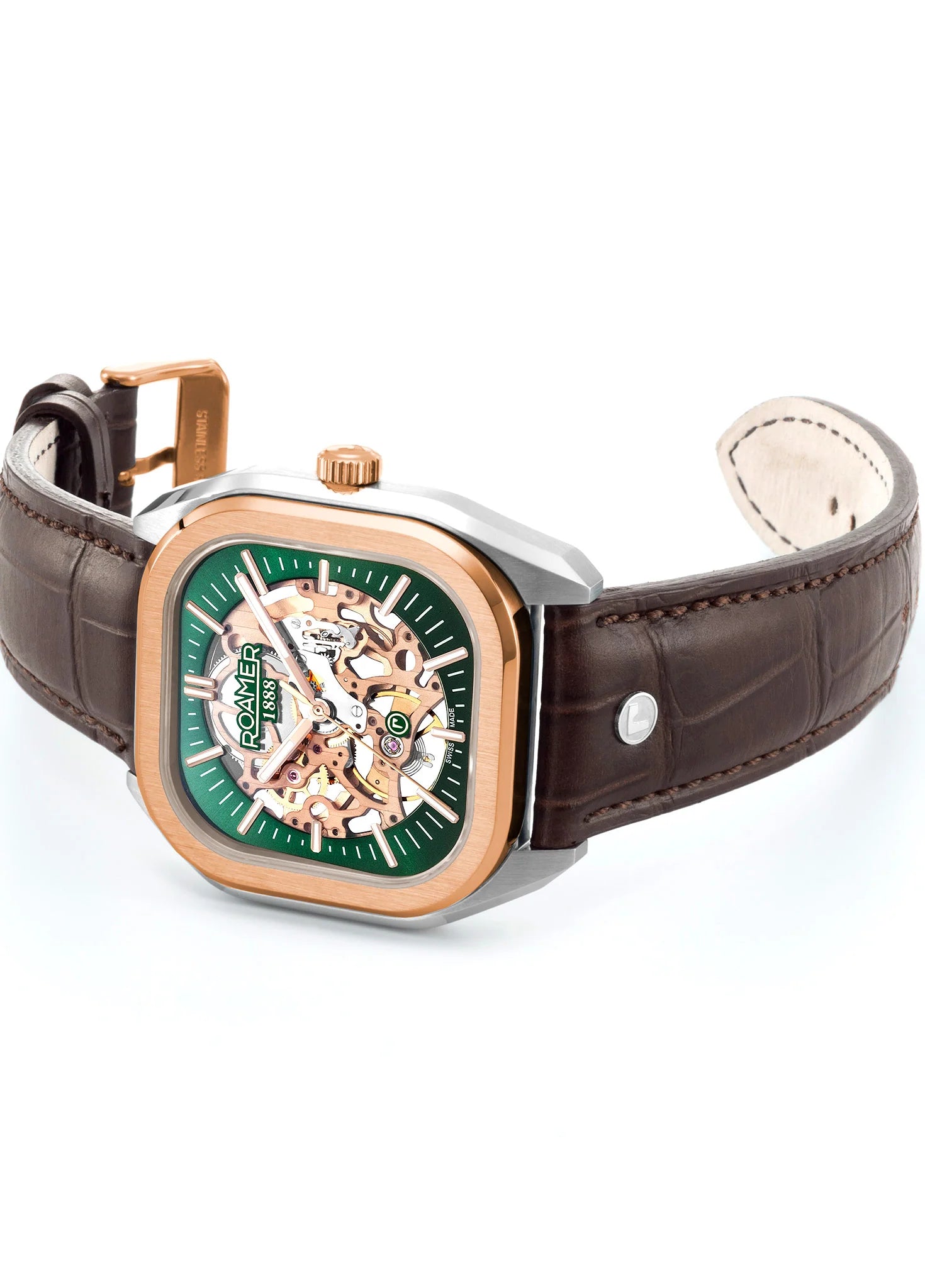 Introducing the Roamer Mechano MST Watch, a perfect blend of Swiss craftsmanship and vintage-inspired design. This stunning 39.5 x 41.5mm square case features a manual winding MST-23 mechanical movement, offering a unique view into its intricate inner workings through the round skeleton window and see-through back-plate.