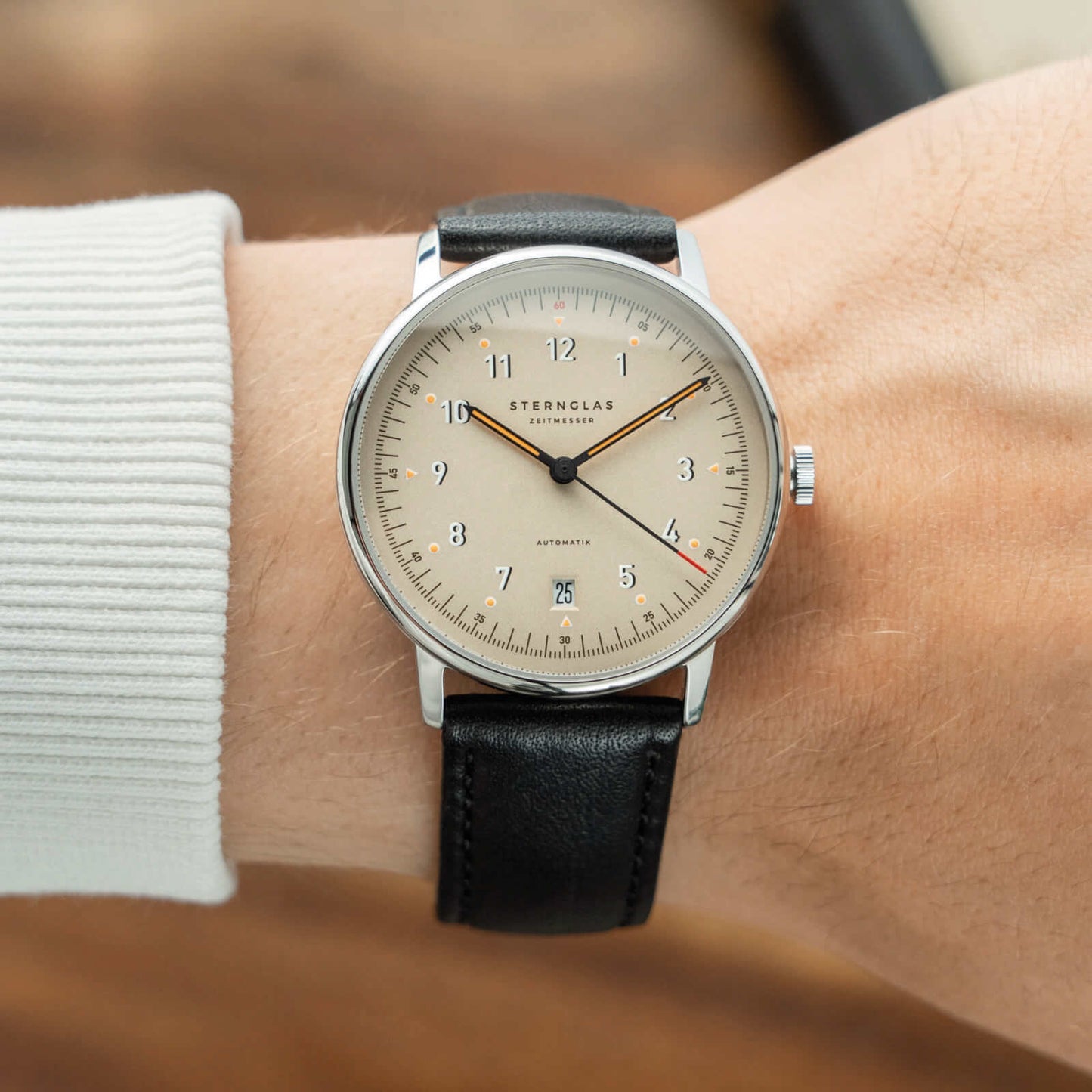 The Sternglas Lumatik Beige brings a bold, functional character to its 38mm polished stainless steel case and layered beige satin-finish dial. A double-domed sapphire crystal with double anti-reflective coating ensures clarity and durability, enhancing the dial's contrasting Luminova elements and black, orange, and red hand accents. Powered by the Miyota 8315 automatic movement, the watch delivers a long 60-hour power reserve, hacking seconds, manual winding capability, and a practical date display at 6 o’clock. Paired with a 20mm black Modena leather strap and rated to 5 ATM water resistance, this edition blends precision engineering with expressive design for a modern everyday timepiece.