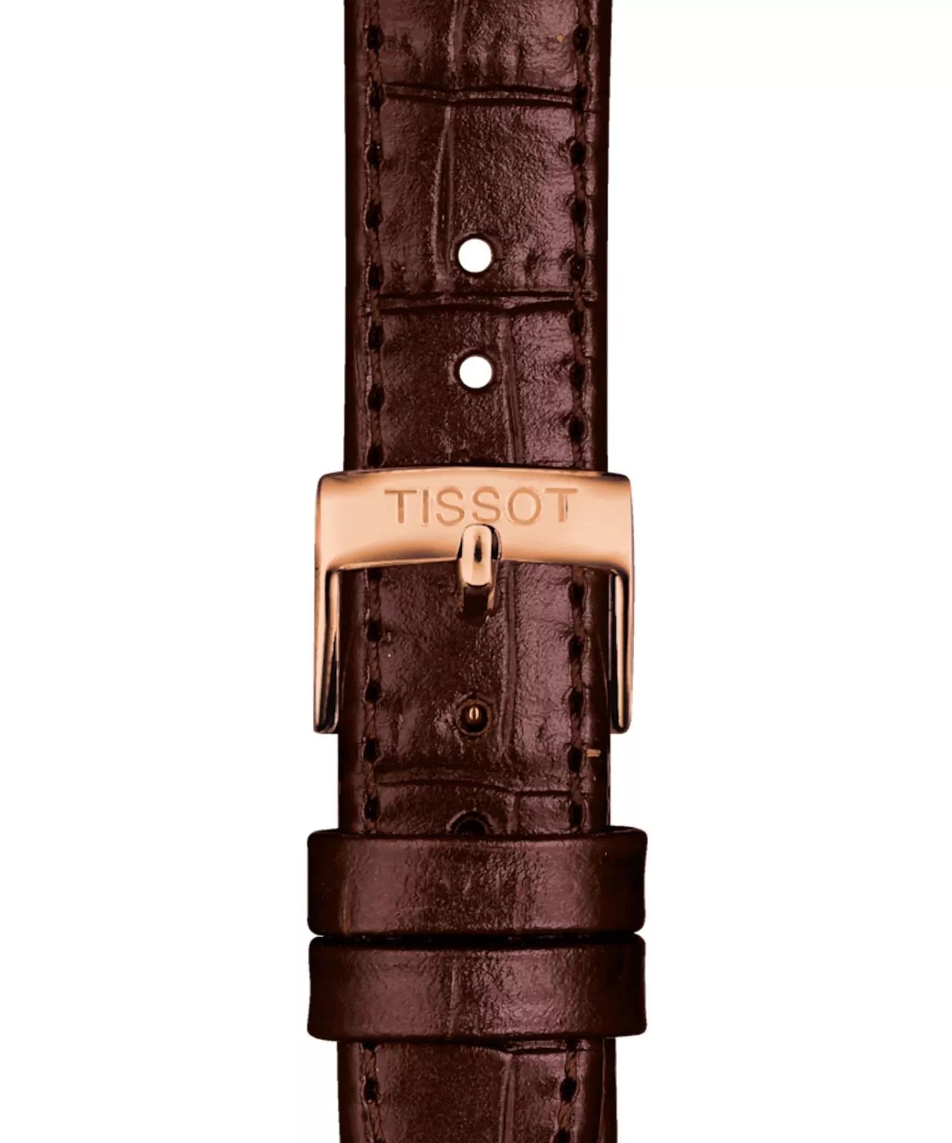 The Tissot Carson Premium Lady T122.210.36.033.00 combines refined aesthetics with enduring Swiss craftsmanship. Its 30mm rose gold PVD–coated case frames a classic silver dial featuring Roman numeral markers and elegant black hands. Powered by the reliable ETA F03.115 quartz movement, it includes a date display positioned above 6 o’clock for balanced symmetry. The scratch-resistant sapphire crystal ensures long-lasting clarity, while the brown leather strap adds a sophisticated and comfortable touch. With 50m water resistance and a slim 6.7mm profile, this timepiece delivers timeless elegance suited for every occasion.
