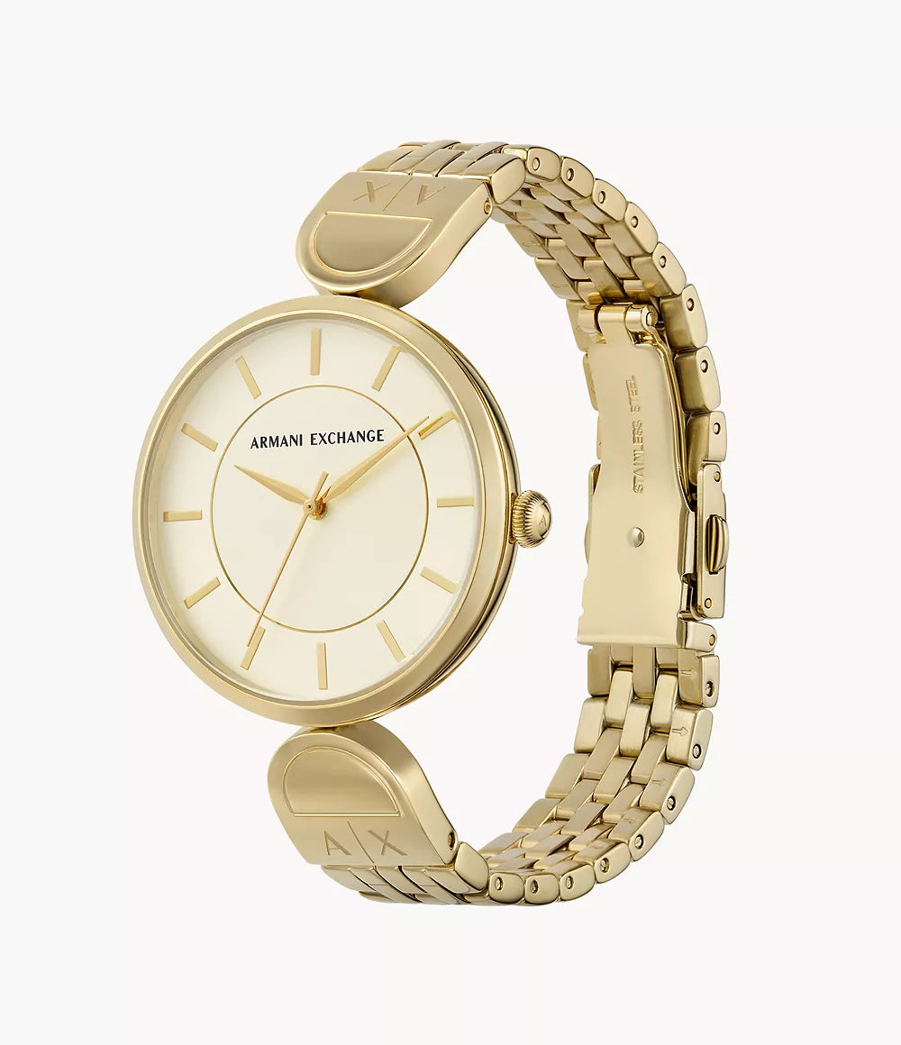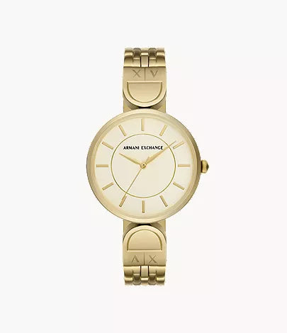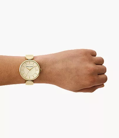 The Armani Exchange Brooke Quartz Ladies Watch embodies chic sophistication with its warm gold-tone finish and soft cream dial. Crafted from stainless steel, the elegant 36mm case and matching bracelet add a touch of timeless luxury to any outfit. The slim, feminine design ensures a comfortable fit, while the minimalist dial design enhances its modern appeal. Protected by a mineral crystal and powered by a dependable quartz movement (battery type SR626SW), this watch offers both durability and style. Perfect for everyday elegance or evening wear.