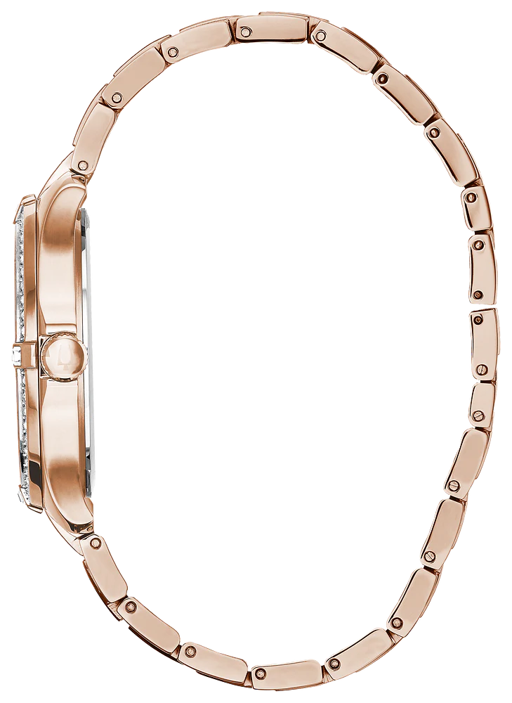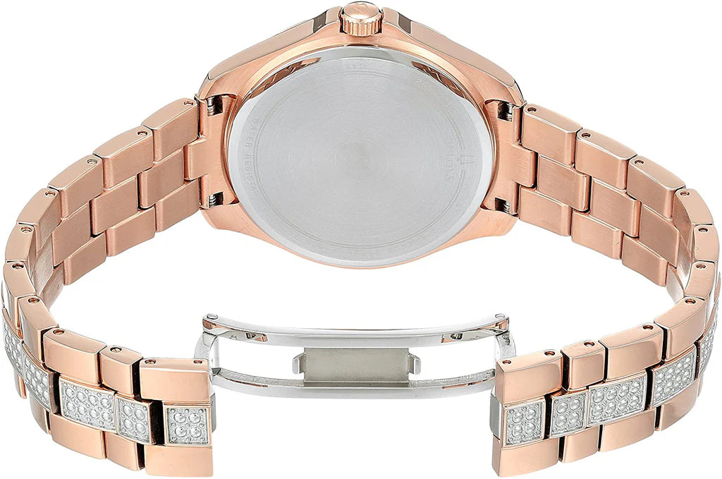 The Bulova Crystal 98L229 is an elegant ladies watch designed with luxurious detailing and timeless appeal. Its 35mm stainless steel case and bracelet feature a refined rose gold-tone finish, enhanced with Swarovski crystals across the case, bezel, and dial for a dazzling look. The silver dial is complemented by rose gold-tone hands and crystal hour markers, offering both clarity and sophistication. Protected by a scratch-resistant mineral crystal, it ensures durability for everyday wear. Powered by a reliable quartz movement, this timepiece delivers accurate timekeeping, making it suitable for both formal occasions and daily elegance. With 30 meters water resistance, it is ideal for light water exposure.