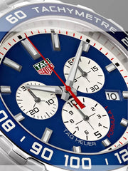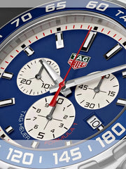 Crafted with a durable stainless steel case and silver-tone stainless steel bracelet, this watch is designed to withstand the wear and tear of everyday use. The fixed silver-tone bezel with a blue top ring showing tachymeter markings is not just stylish but also functional, allowing you to accurately measure speed.