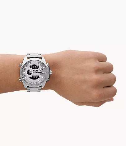 The Diesel Mega Chief DZ4648 redefines bold style with its powerful design and distinctive negative digital display. Crafted from stainless steel, the silver-tone case and bracelet exude strength and durability, embodying Diesel’s signature industrial aesthetic. Its large-format digital screen delivers clear readability and modern appeal, while the bracelet deployant clasp ensures a secure, comfortable fit. Built with a sturdy mineral crystal for everyday protection and powered by a long-lasting CR2025 battery, this watch combines toughness with cutting-edge style — perfect for those who like to stand out.