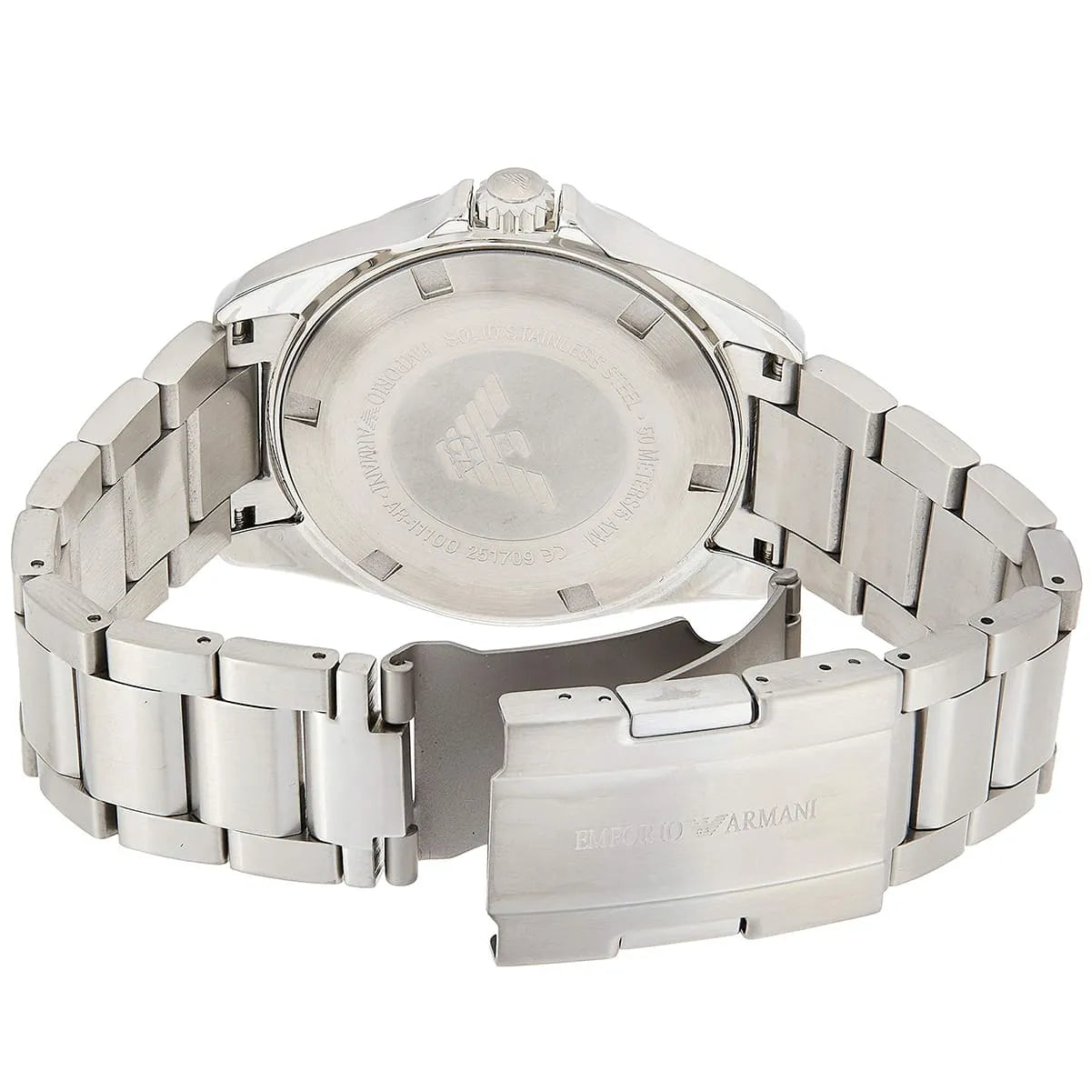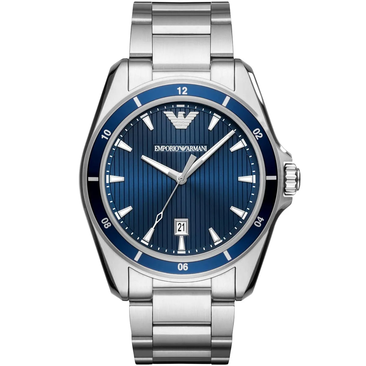 The Emporio Armani AR11100 Men’s Watch offers a perfect blend of elegance and functionality. Featuring a 44mm round silver stainless steel case with a striking blue dial, it exudes a sophisticated style. Powered by a reliable quartz movement, the watch includes a monthly date display for everyday convenience. The silver stainless steel bracelet provides durability and a secure fit, while 50 meters of water resistance ensures protection from splashes and everyday exposure. Designed by Giorgio Armani, this watch is ideal for both casual and formal occasions.