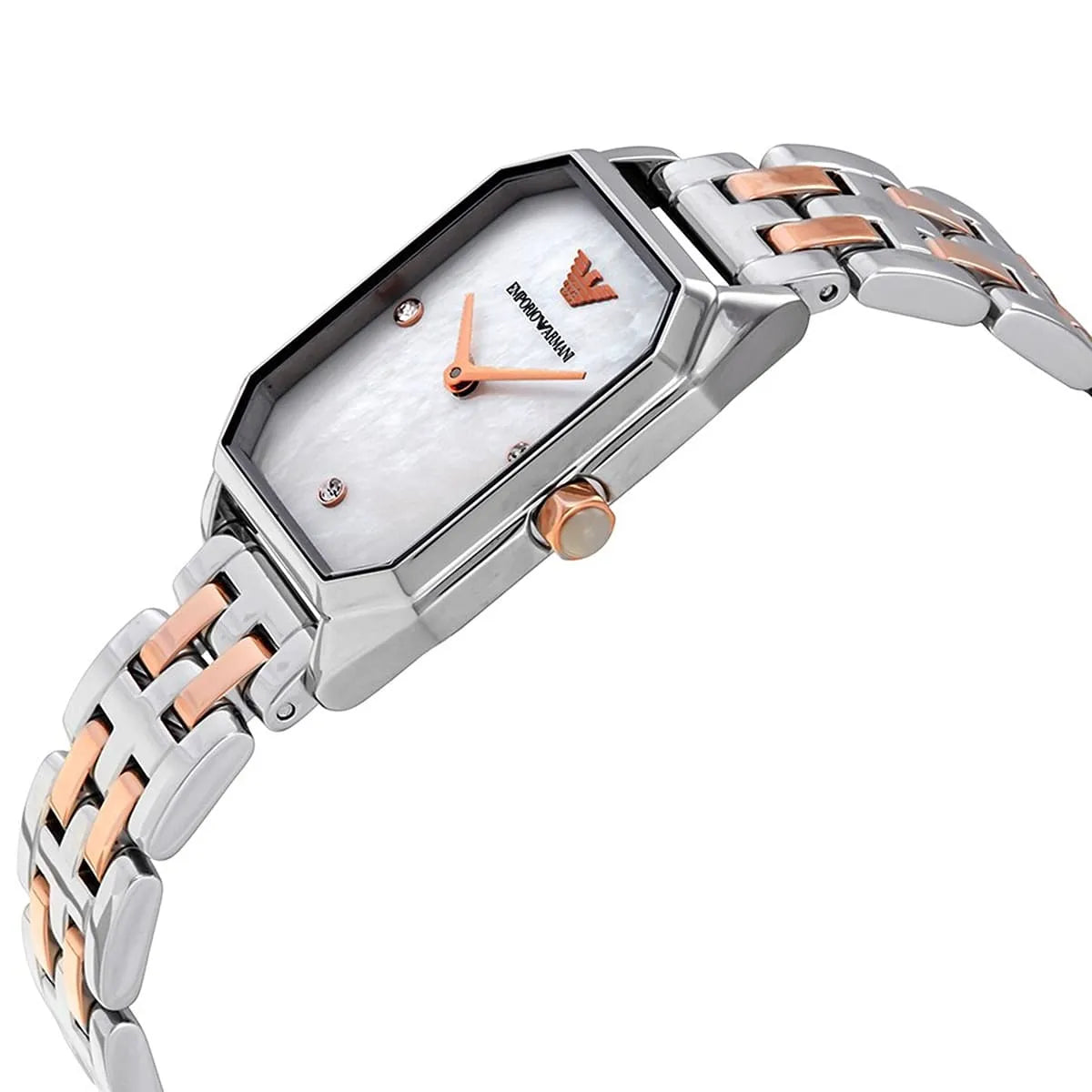 The Emporio Armani AR11146 Women’s Watch combines elegance and contemporary design. Featuring a 24mm square case with a white dial, this watch offers a chic and refined look. Powered by a quartz movement, it ensures accurate timekeeping for everyday wear. The two-tone silver and rose gold stainless steel bracelet adds sophistication and durability, while 30 meters of water resistance protects it from splashes. Designed by Giorgio Armani, this timepiece is perfect for casual or formal occasions.