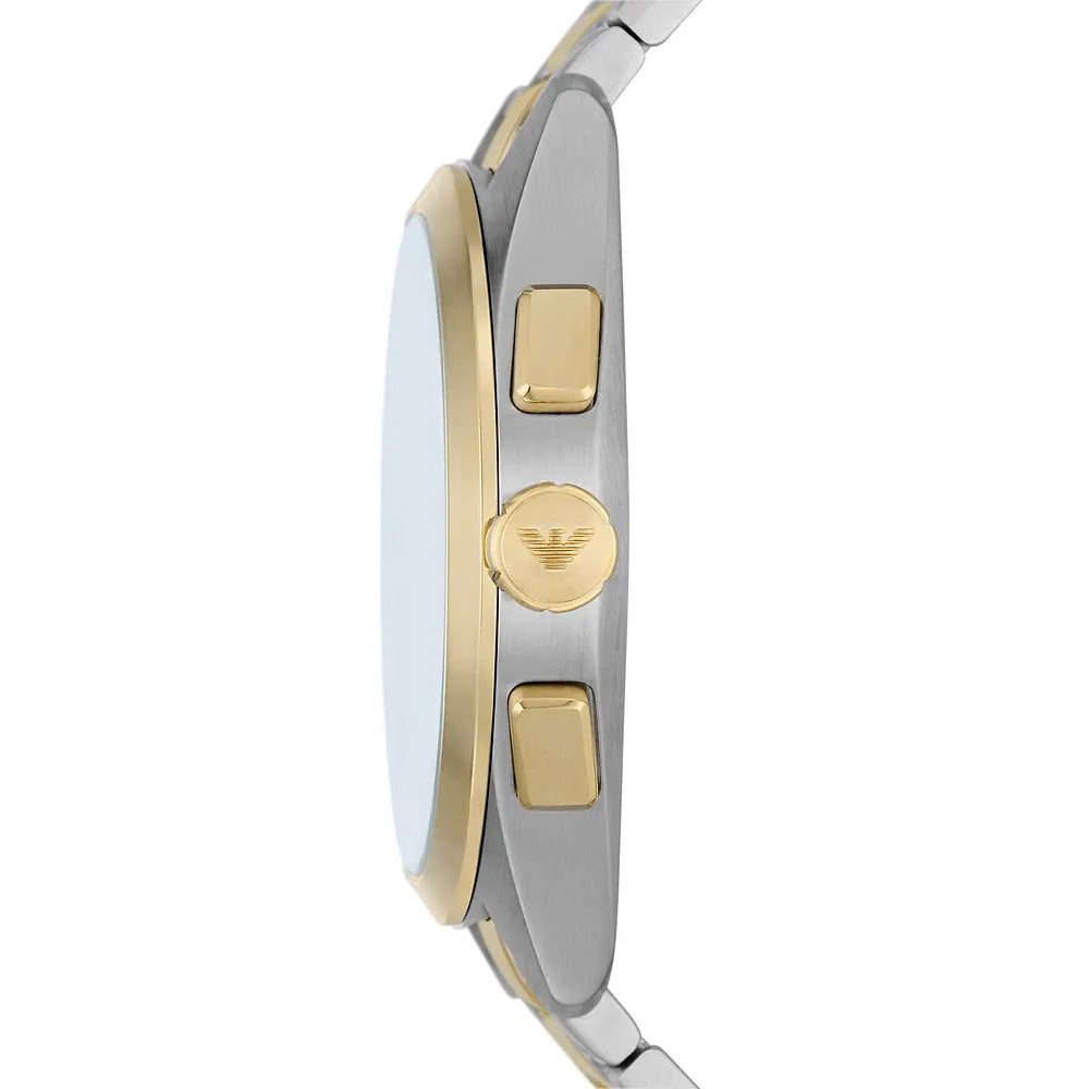 The Emporio Armani AR11511 Chronograph showcases bold sophistication through its unique green dial and luxurious two-tone design. Crafted with a 43 mm stainless steel case and gold-tone bezel, this timepiece balances elegance and performance. Gold-tone hands and index markers contrast beautifully against the green dial, while two chronograph subdials measure 60 seconds and 60 minutes with precision. The two-tone bracelet, finished in silver and gold, adds a refined edge and is secured with a deployment clasp featuring push-button release. Protected by a scratch-resistant mineral crystal and powered by dependable quartz movement, the AR11511 makes a statement of refined modern style.