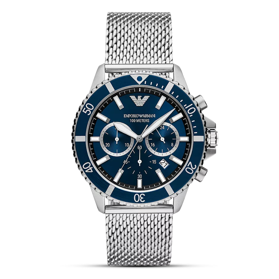 The Emporio Armani AR11587 World Explorer blends refined styling with functional capability, designed around a 43mm stainless steel case and a striking dark blue sunray dial. Powered by a reliable quartz chronograph movement, it offers precise timing, a date display, and durable mineral crystal protection. The stainless steel mesh bracelet provides a modern, streamlined look while ensuring a comfortable fit for daily wear. With 100M water resistance, SKU AR11587 is built for adventure, travel, and everyday versatility while showcasing Emporio Armani’s signature sophistication.