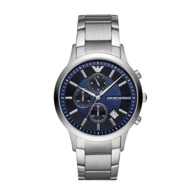 The Emporio Armani AR11164 blends contemporary design with dependable performance for the modern man. Its 43mm stainless steel case houses a rich blue dial, accented with silver-tone hands and markers for clean, easy readability. Powered by a precise quartz chronograph movement, it features three functional sub-dials and a date display for everyday practicality. A durable stainless steel bracelet, secured with a butterfly deployant clasp, ensures both comfort and a refined finish. With 5 ATM water resistance, this timepiece is built for daily wear and light exposure to water, making it a versatile and stylish companion.