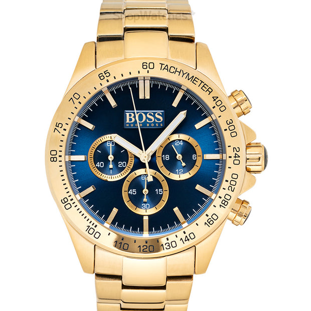 The Hugo Boss HB1513340 Ikon Chronograph blends luxury detailing with reliable performance, presented in a bold 44 mm gold ion-plated stainless steel case. Its blue enamel dial adds striking depth and elegance, complemented by gold-tone hands and clean index markers for refined readability. Protected by a scratch-resistant mineral crystal, the watch is designed for everyday durability while maintaining a polished aesthetic. Powered by a precise quartz movement, it delivers consistent accuracy suited for both formal occasions and daily wear. Integrating SKU HB1513340 seamlessly, this timepiece reflects the contemporary sophistication and craftsmanship that define the Hugo Boss Ikon series.