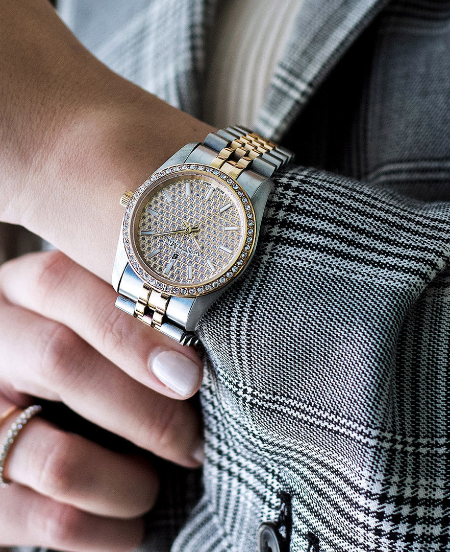 The two-tone silver and gold stainless steel bracelet enhances its versatility and elegance, making it a statement piece for both formal events and everyday luxury. Powered by a Swiss quartz movement, this watch ensures exceptional accuracy with minimal maintenance. The scratch-resistant mineral crystal provides durability, while the 5 ATM water resistance ensures worry-free daily wear, including showering. The bracelet with a secure clasp offers a comfortable and adjustable fit, making it an essential addition to any fashion-forward collection.