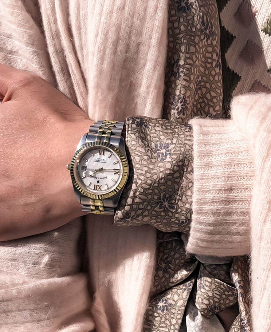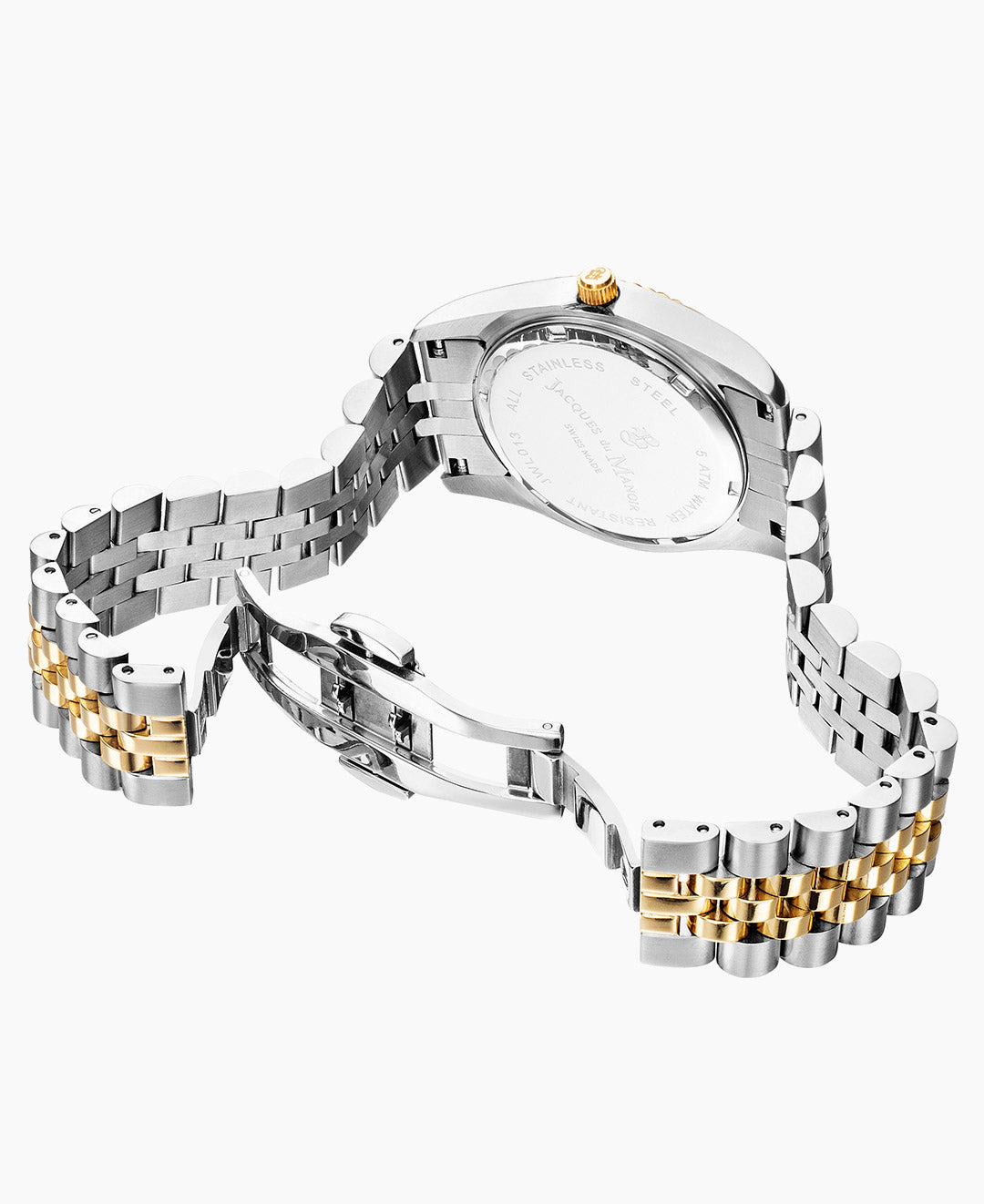 The Jacques Du Manoir Inspiration Roman JWL01303 brings together shimmering metal tones and refined feminine details in a timeless 34mm design. Its two-tone stainless steel case and bracelet offer a striking contrast, beautifully complementing the clean white dial with classic Roman numeral elements. Powered by a reliable quartz movement, the watch ensures precise timekeeping with a practical date function for everyday convenience. Designed to capture attention while remaining effortlessly elegant, this piece embodies modern sophistication with a subtle unisex undertone. With 5 ATM water resistance, it provides durability suitable for daily wear while maintaining its polished, luxurious look.