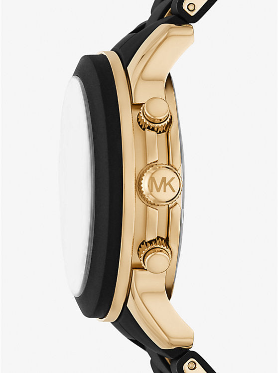 The Michael Kors Oversized Runway MK7385 is designed to make a striking impression with its bold 45 mm gold-tone stainless steel case and contrasting black dial. Featuring chronograph sub-dials and a date window, the watch blends functional precision with fashionable impact. The strap combines gold-tone hardware with a black silicone finish for a modern twist on luxury styling. With a quartz chronograph movement and 10 ATM water resistance, this timepiece offers durability and versatility for daily wear or special occasions. Protected by a mineral crystal, the MK7385 brings both statement design and reliable performance.