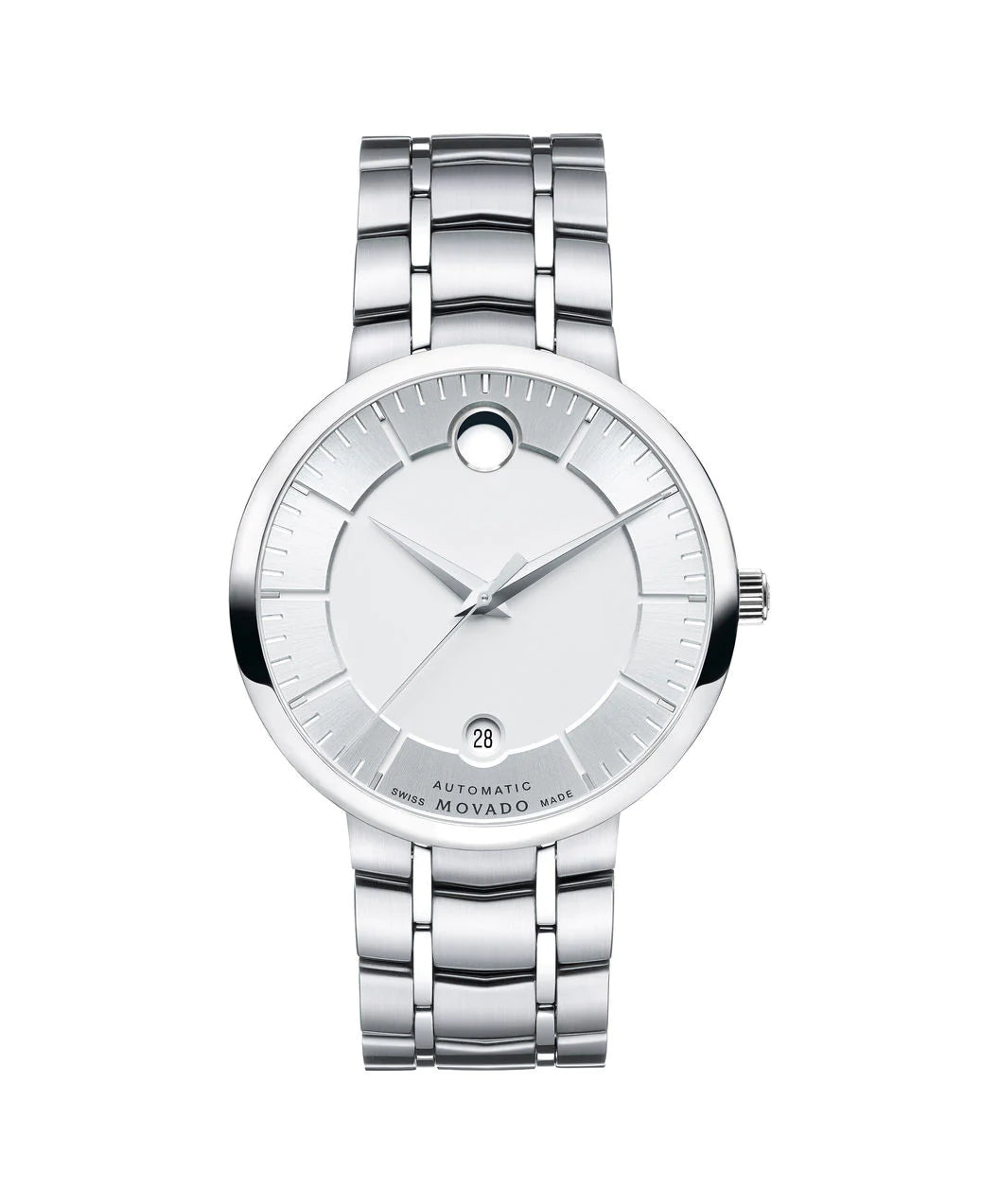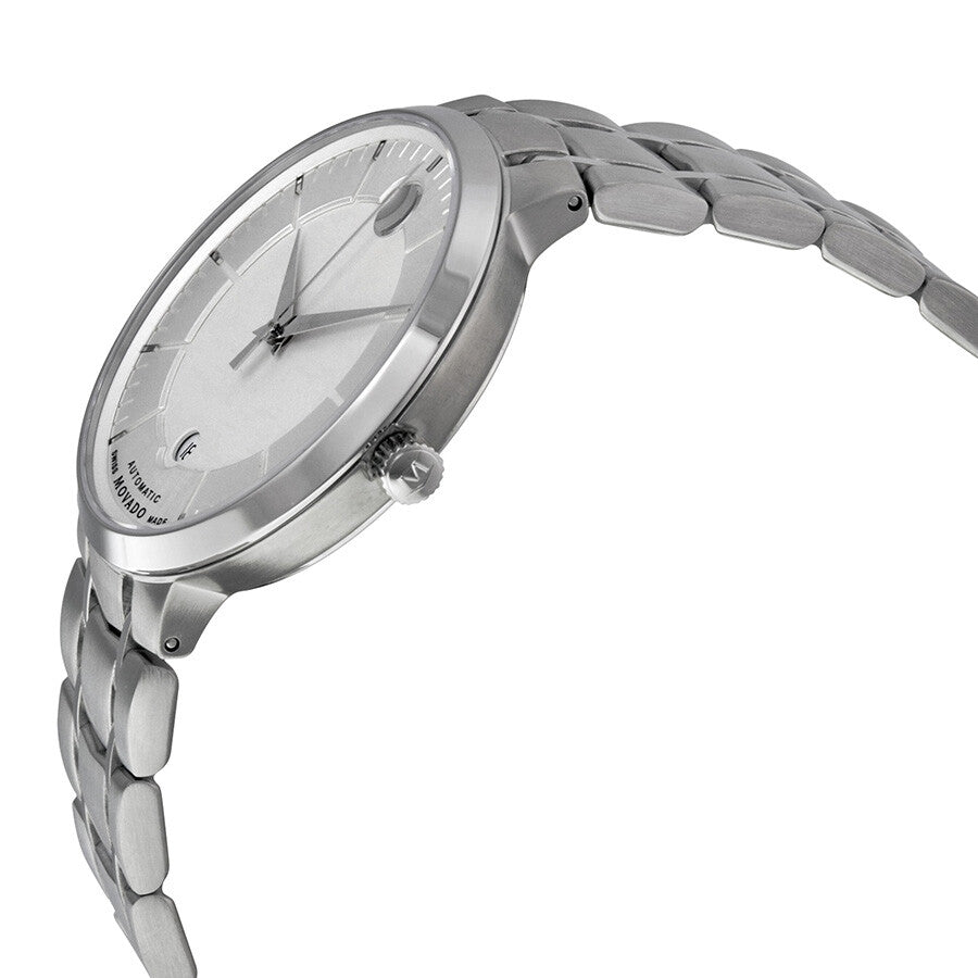Silver dial with dauphine hands, index markers, and signature Movado dot at 12