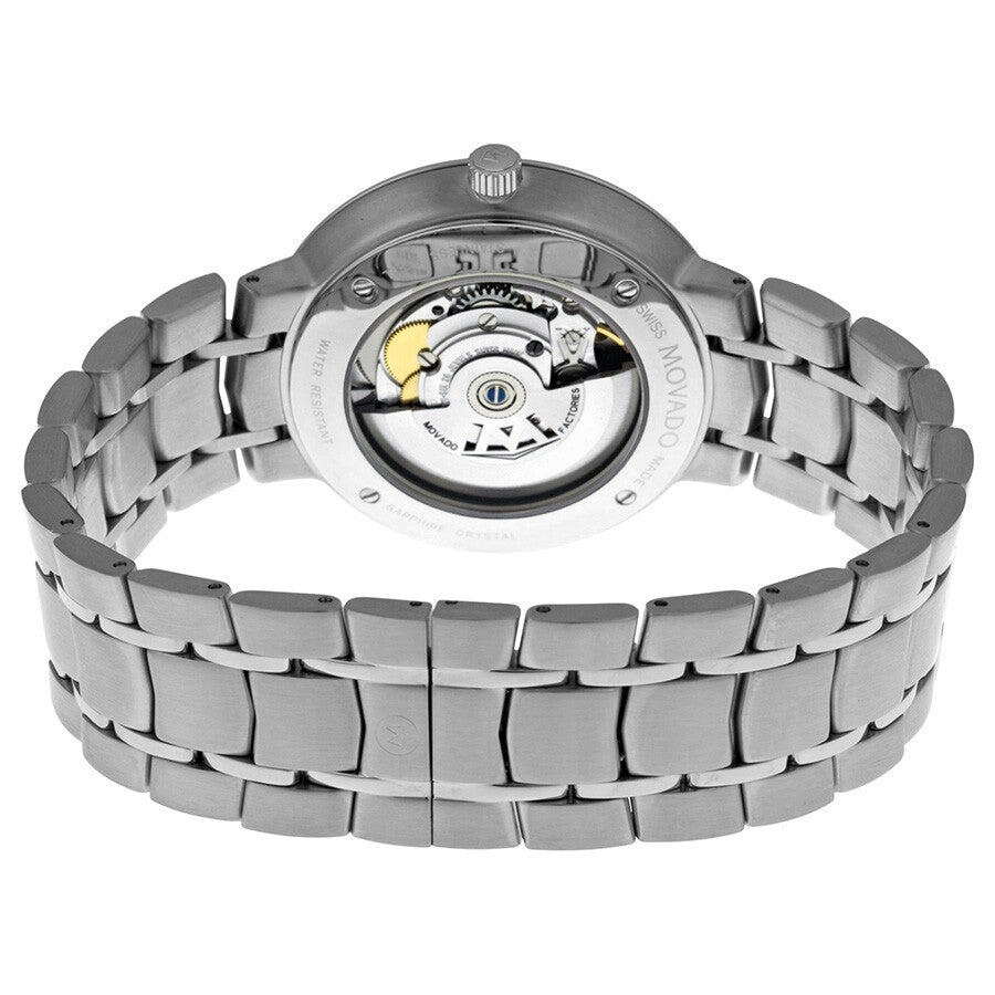 The Movado 1881 Mens Watch 0606915 blends timeless refinement with Swiss automatic engineering. Its 39.5 mm stainless steel case presents a clean silver dial accented by dauphine-style hands, subtle index markers, and the signature Movado dot that anchors the minimalist aesthetic. Protected by a scratch-resistant sapphire crystal, the dial remains crisp and clear, while the skeleton exhibition back reveals the inner workings of the ETA 2824-2 movement offering a 40-hour power reserve. A matching stainless steel bracelet enhances its versatile, modern look, making this piece suitable for both business and elevated casual wear. Crafted for enthusiasts who appreciate mechanical precision, the Movado 1881 SKU 0606915 delivers luxury in a clean, contemporary silhouette.