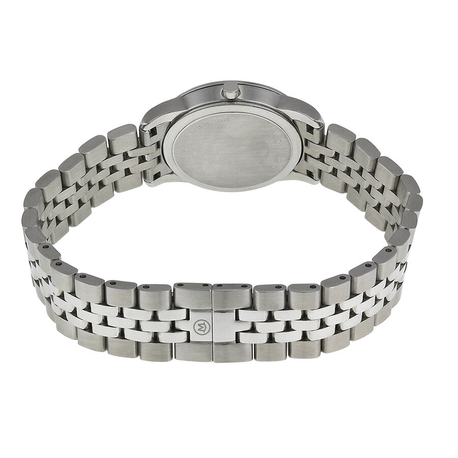 • Black dial with silver-tone dauphine-style hands and signature Movado dot