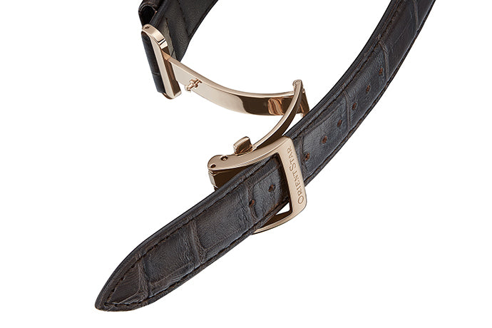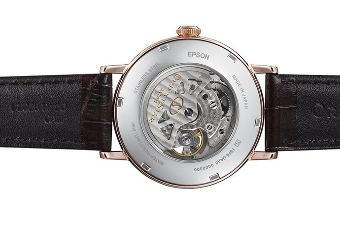 The Orient Star RE-AV0001S blends timeless elegance with high-precision Japanese craftsmanship. Its boxed crystal glass and semi-skeleton aperture reveal the refined movement finished through an enhanced manufacturing process for improved accuracy. Roman numerals, a balanced subdial layout, and a polished stainless steel case create a visually captivating presence that feels classic yet contemporary.