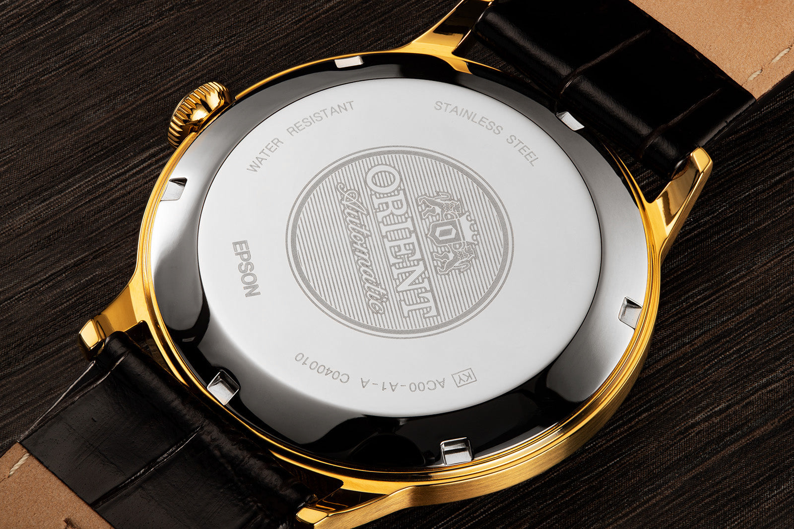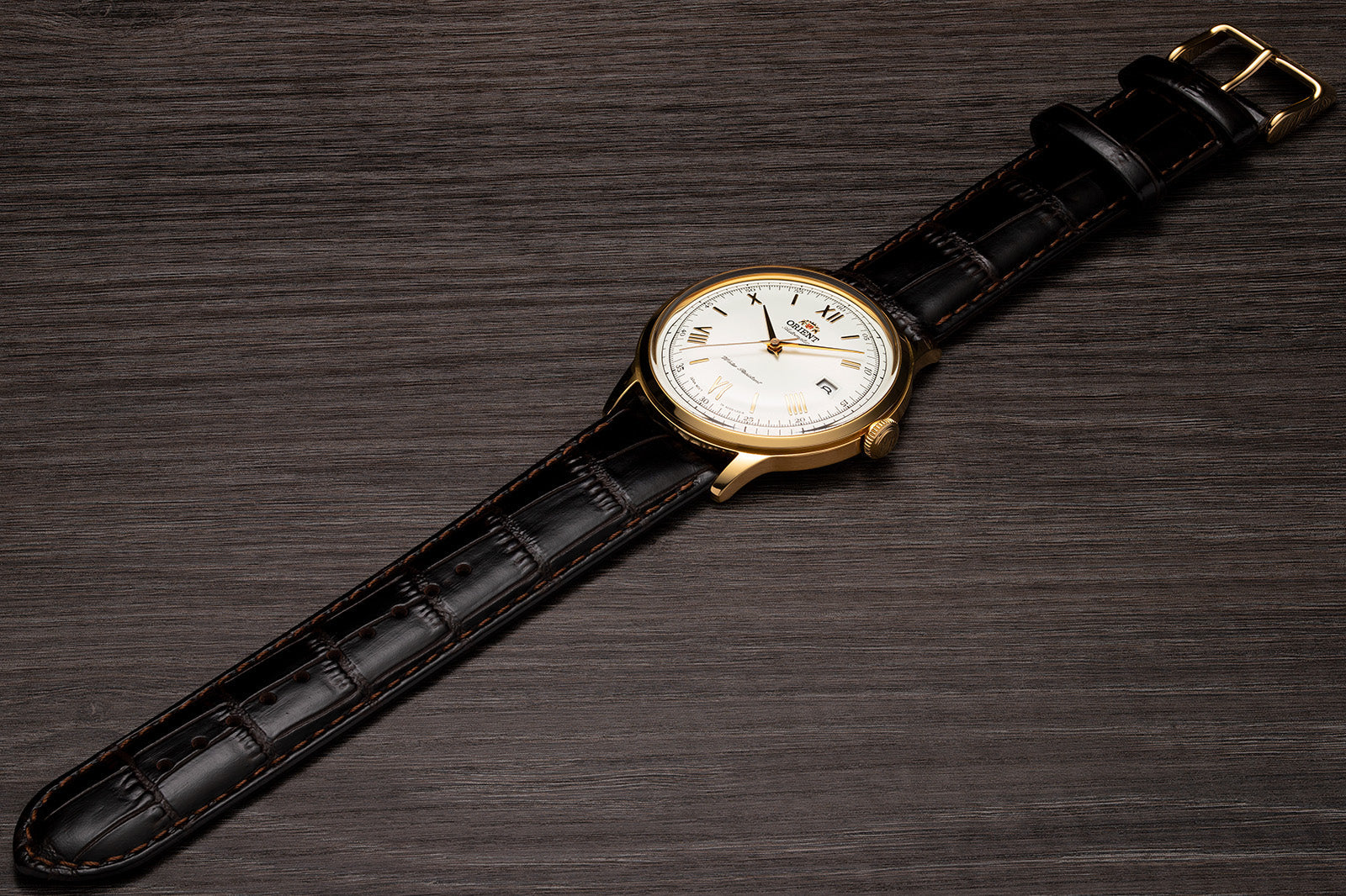 The Orient Bambino Version 2 TAC00007W0 embraces a beautifully refined vintage aesthetic. Its domed mineral crystal, Roman numeral indices, and distinctive onion crown bring classic dress-watch elegance into a modern 40.5mm design. The clean white dial enhances the watch’s sophistication, creating a striking contrast with the yellow-gold case.