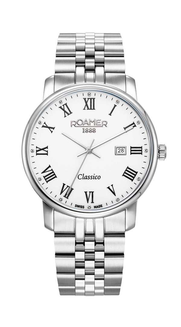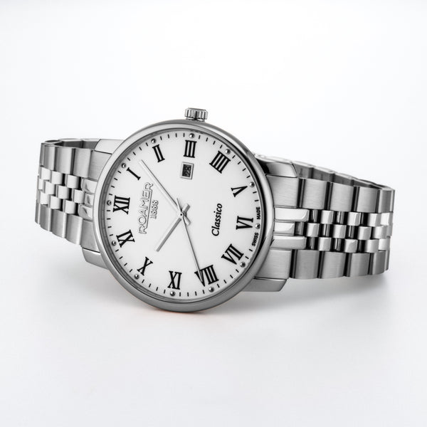 The Roamer Classico 971856 41 25 50 offers clean Swiss sophistication in a timeless 40mm design. Its crisp white dial, refined markers, and practical date display create a classic and versatile look suitable for daily wear. Powered by the Swiss Ronda 705 quartz movement, it delivers precise and reliable timekeeping, while the sapphire crystal ensures excellent scratch resistance. The polished stainless steel case and bracelet provide durability and long-lasting elegance, making this Classico model a perfect everyday companion with true Swiss quality.