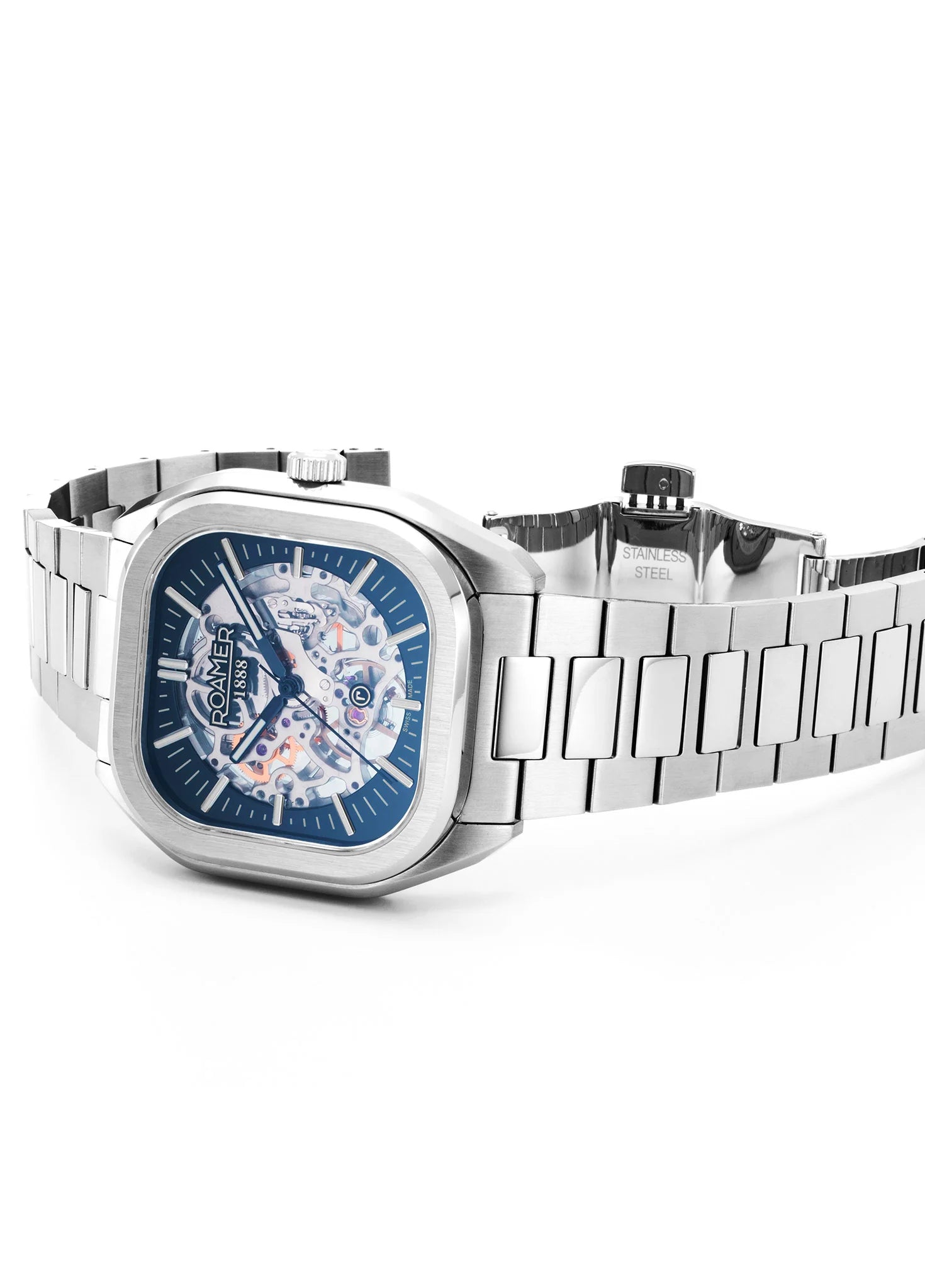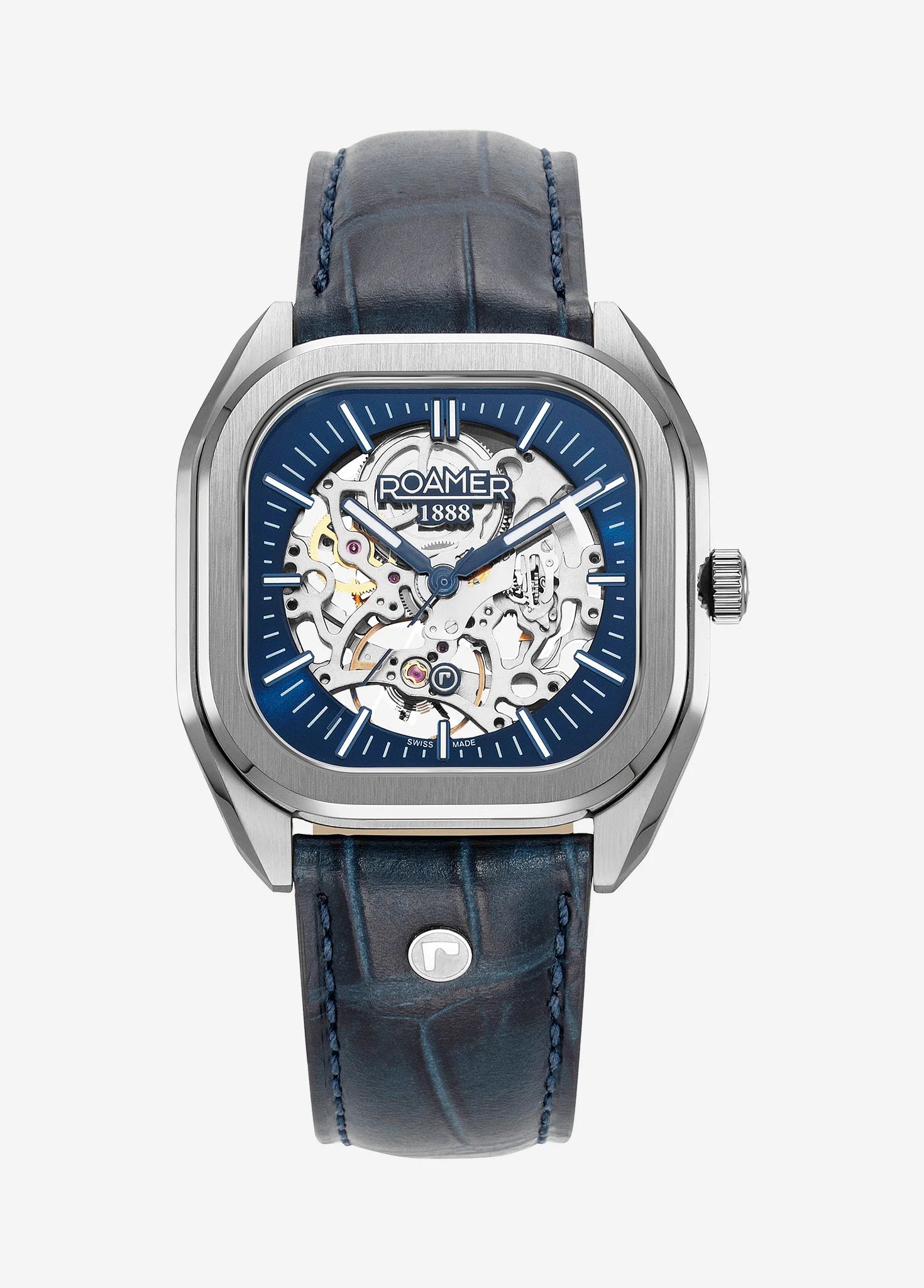 Introducing the Roamer Mechano Men's Watch, a fusion of Swiss Made precision and vintage-inspired design. This timepiece features a manual winding MST-23 movement, celebrated for its exceptional craftsmanship. The 39.5 x 41.5mm square case and softly rounded corners create a timeless look, while the skeleton window offers a captivating view of the intricate Swiss mechanical movement, signed by Meyer & Stüdeli.