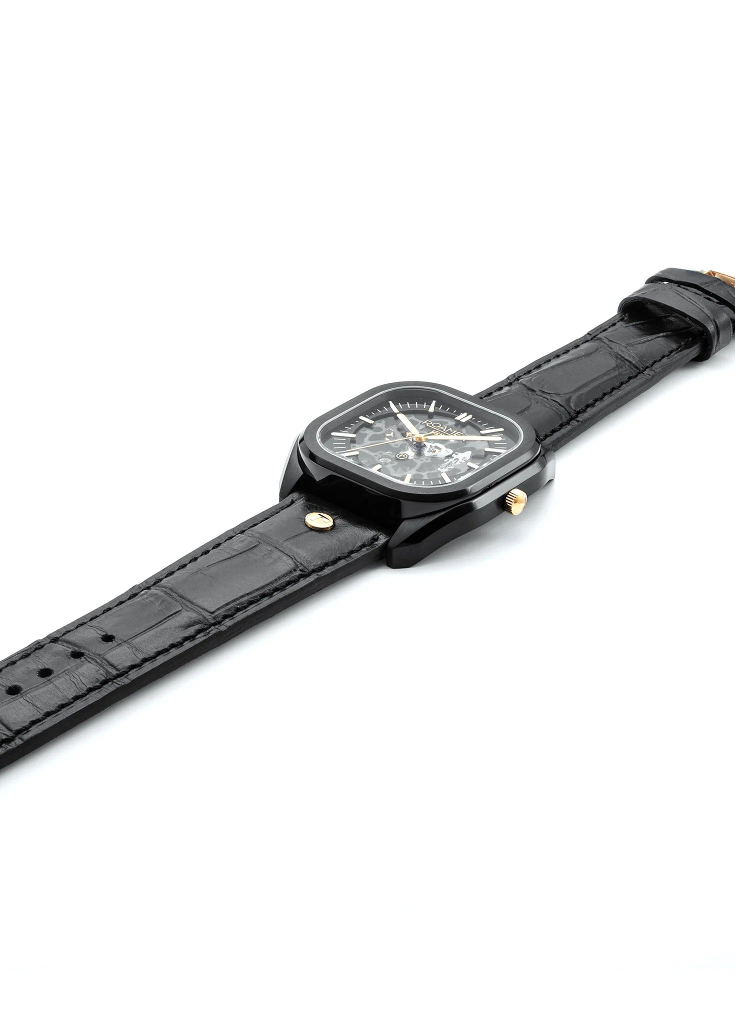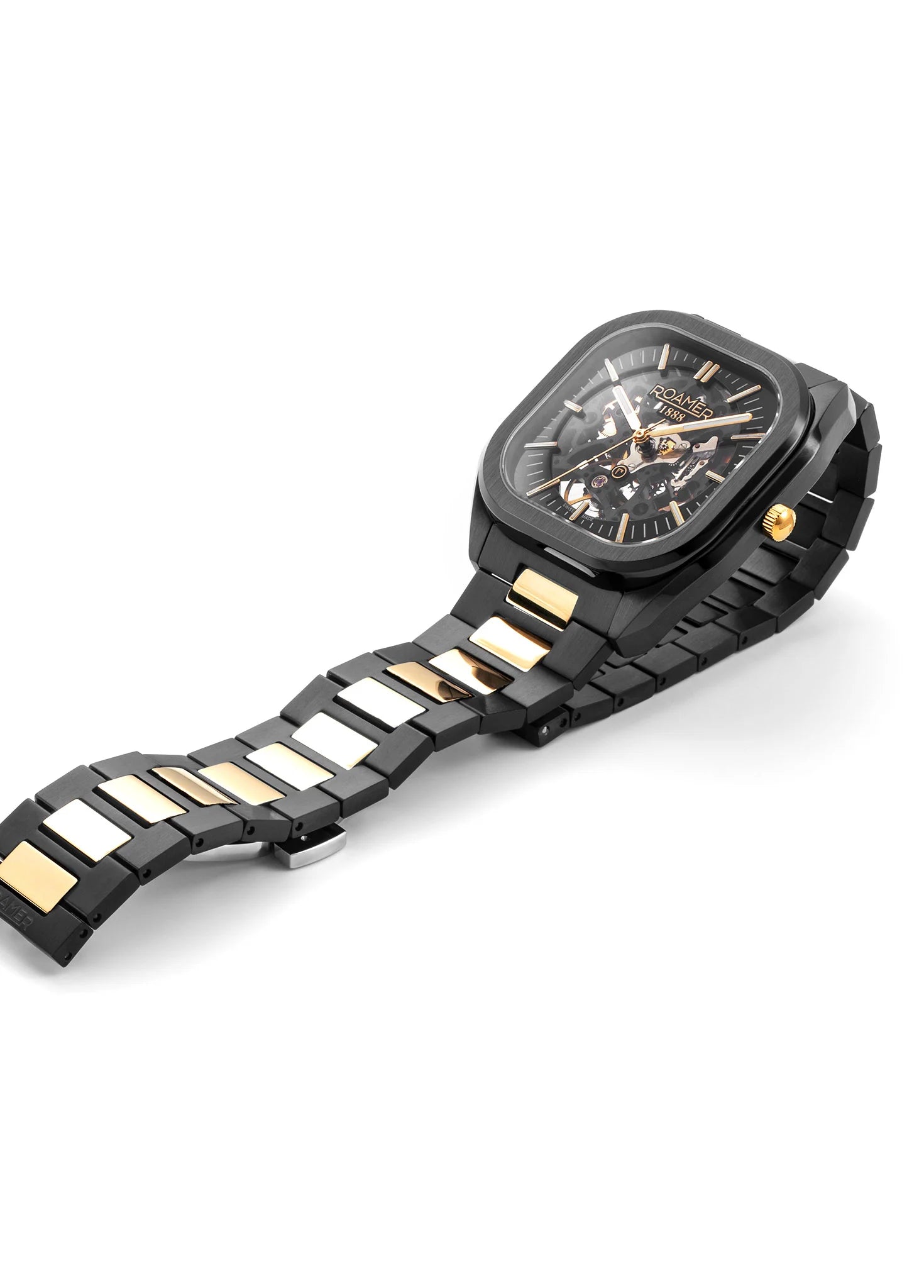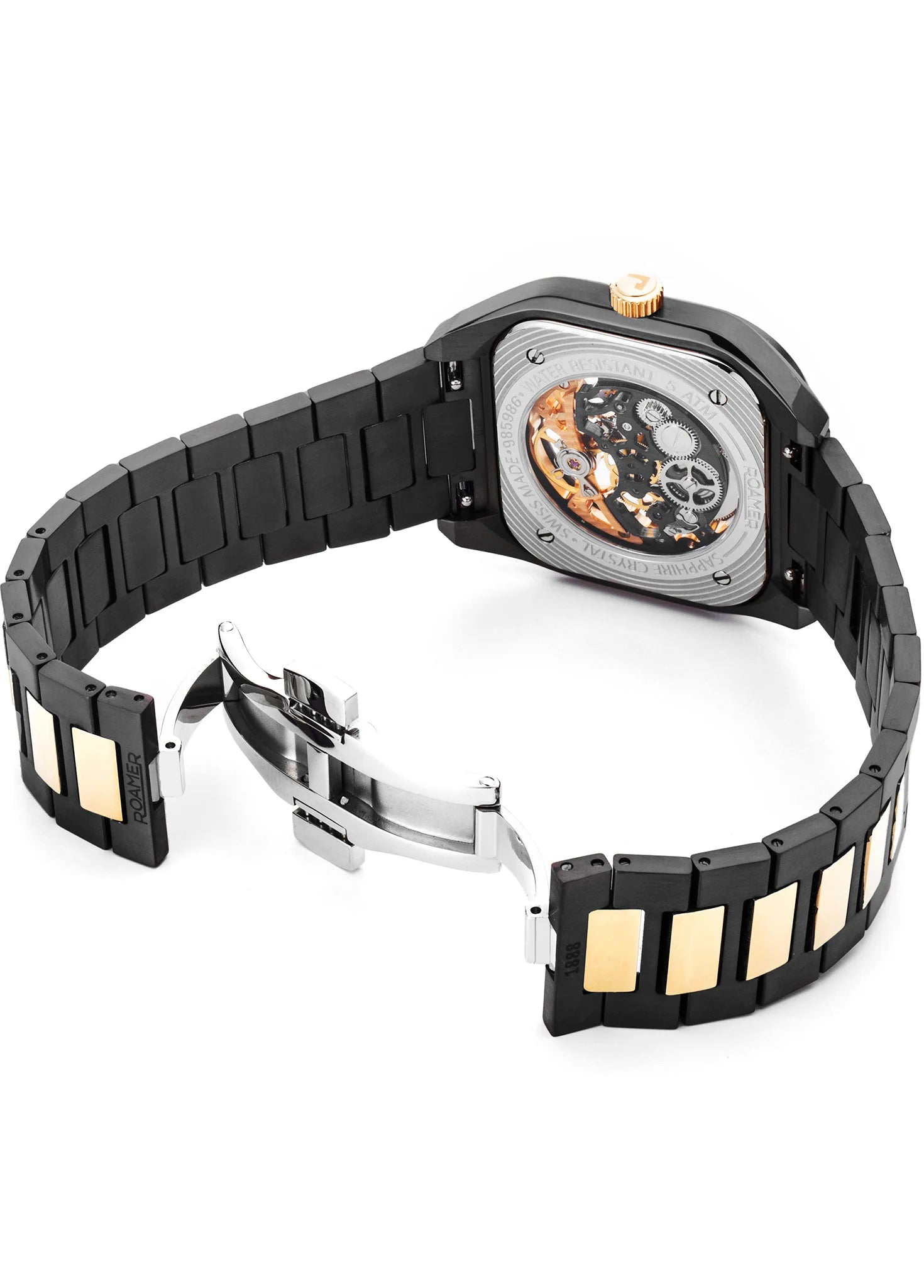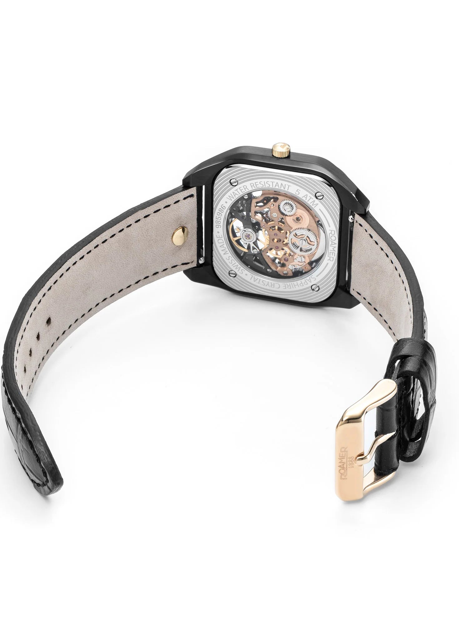 The Roamer Mechano MST 985986 45 85 20 combines vintage-inspired aesthetics with authentic Swiss mechanical craftsmanship. Its distinctive square 39.5 × 41.5 mm case houses the manual-winding MST-23 movement, visible through a round skeleton window on the dial and a full exhibition caseback. The black dial features applied indices and elegant double markers at 12 o’clock, paired with a striking black and gold-tone case for a bold, refined look. Protected by an anti-reflective sapphire crystal and rated to 5 ATM water resistance, the watch is built for everyday sophistication. It includes interchangeable crocodile-embossed leather straps in black, blue, and brown for added versatility.