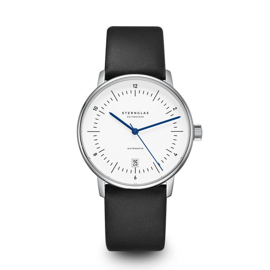 The Sternglas automatic watch embodies Bauhaus-inspired simplicity with modern precision. A 38mm polished 316L stainless steel case houses a crisp white dial with blue hands, protected by a double-domed sapphire crystal with anti-reflective coating. Powered by the Miyota 8125 automatic movement, it delivers up to 42 hours of reserve, hacking seconds, and a date display with an accuracy of –20/+40s per day. Water resistant to 5 ATM, this timepiece offers strap options in genuine calfskin (dark brown, black, or brown) or a refined silver Milanese bracelet.