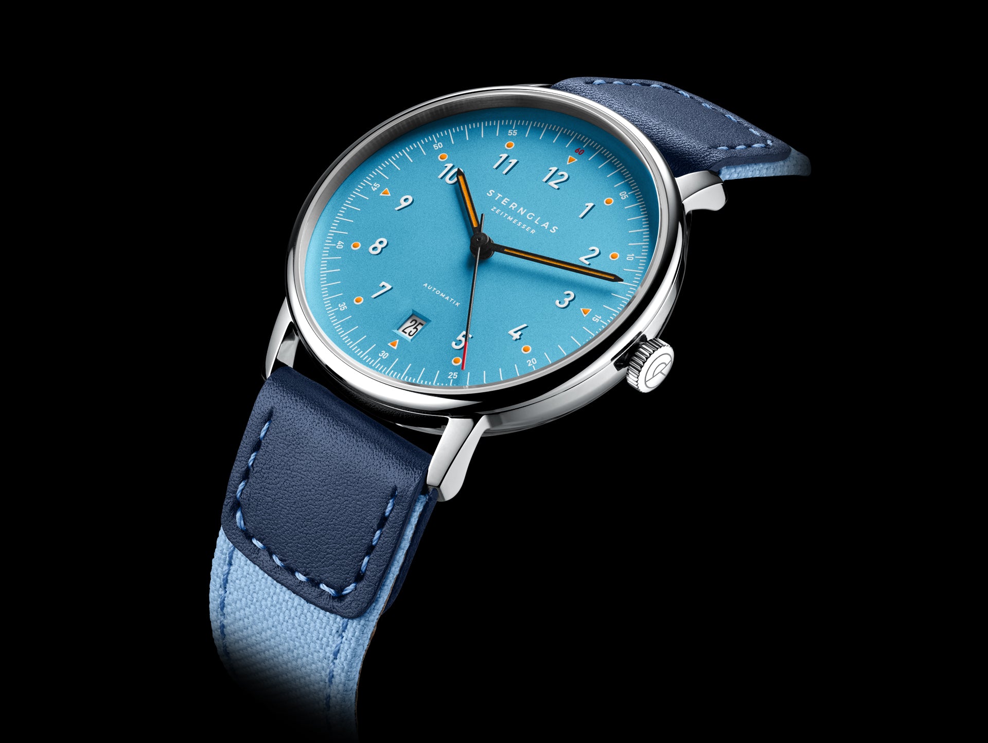The Sternglas Lumatik Automatic is designed for exceptional legibility and everyday reliability, combining functional design with modern German aesthetics. Its light blue satin-finished dial features luminous white numerals, orange indexes, and bold black and orange hands enhanced with dual-tone Luminova for clear visibility in low-light conditions. Housed in a 38mm polished stainless steel case, the watch is powered by the Miyota 8315 automatic movement, offering self-winding performance and an extended 60-hour power reserve. A double-domed sapphire crystal with double anti-reflective coating provides durability and clarity, while the date display at 6 o’clock adds practical functionality. The lightweight light blue nylon strap is breathable, sweat-resistant, and well suited for active daily wear. With 5 ATM water resistance, the Lumatik is built to transition seamlessly from outdoor activity to everyday style.