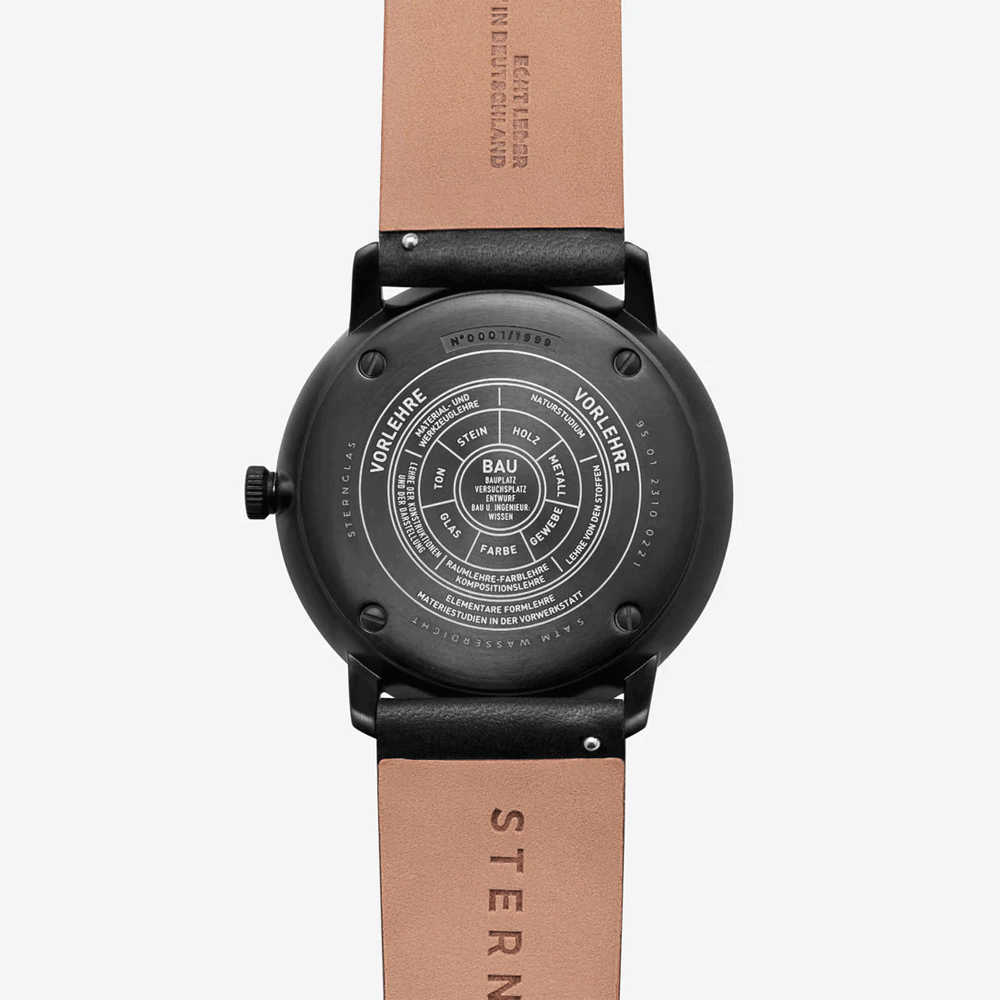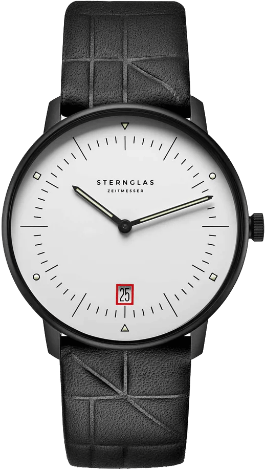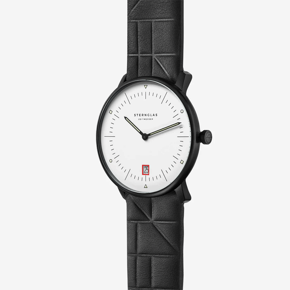 The Sternglas Naos Edition Bauhaus III brings classic Bauhaus minimalism into a refined 38mm design. Its matte black 316L stainless steel case surrounds a clean white dial with precise black hands for excellent readability. The domed sapphire crystal with double anti-reflective coating offers long-lasting clarity and durability. Powered by the Swiss Ronda 714 quartz movement, it ensures reliable timekeeping along with a practical date display. Completed with a 20mm black Editionsband leather strap and 5 ATM water resistance, this watch is crafted for everyday elegance and dependable performance.
